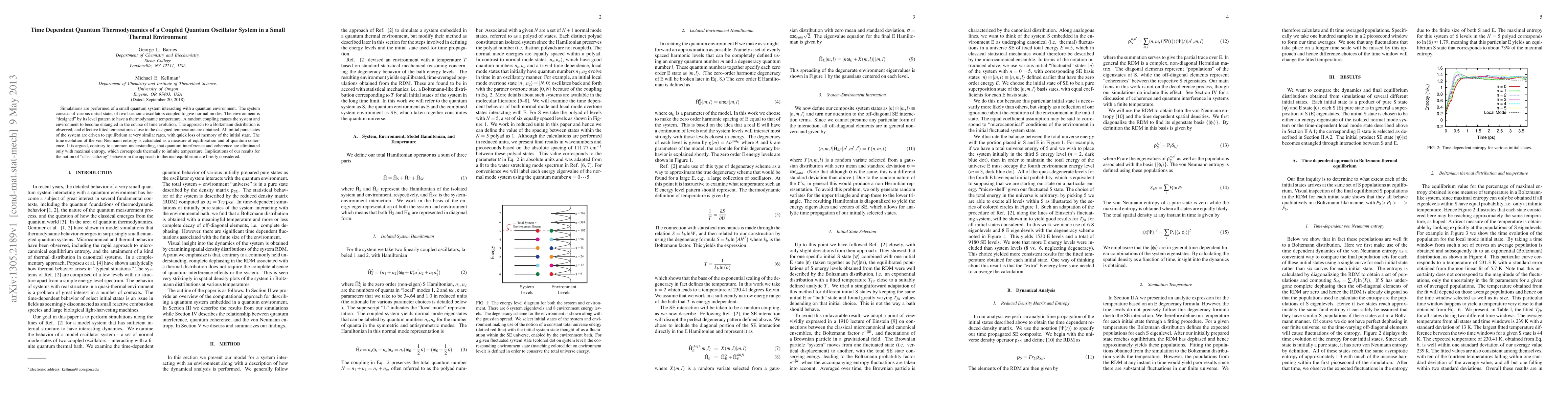 This paper investigates the time-dependent quantum thermodynamics of a coupled quantum oscillator system interacting with a small thermal environment. The study finds that all initial states reach equilibrium at similar rates, with quantum coherence diminishing only at infinite temperature, challenging conventional views on thermal equilibrium.