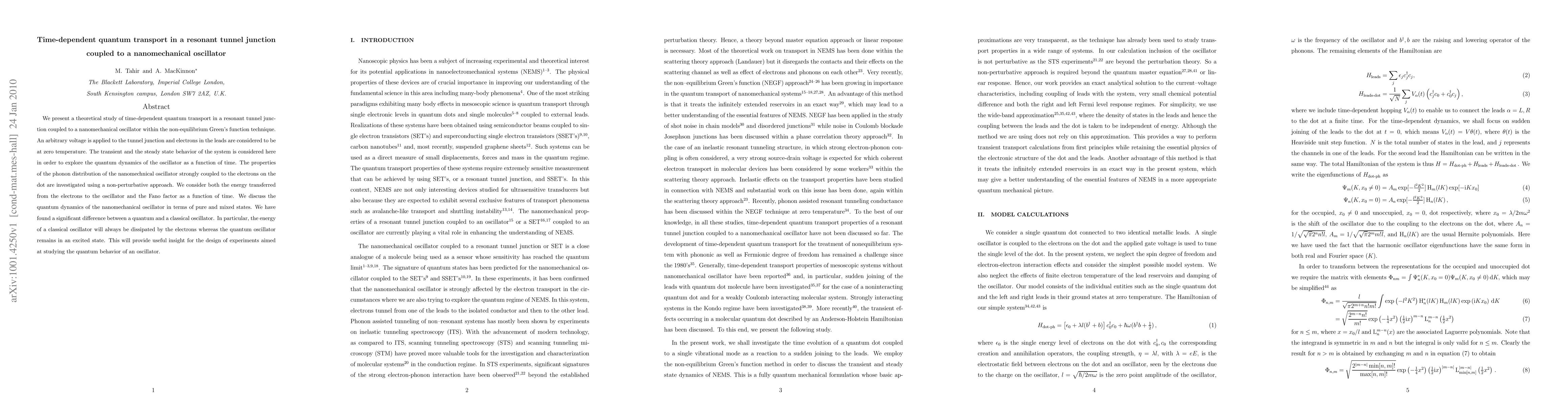 This paper investigates time-dependent quantum transport in a resonant tunnel junction coupled to a nanomechanical oscillator using non-equilibrium Green's functions. The study reveals significant differences in energy dynamics between quantum and classical oscillators, showing that quantum oscillators can remain in an excited state while classical ones dissipate energy.