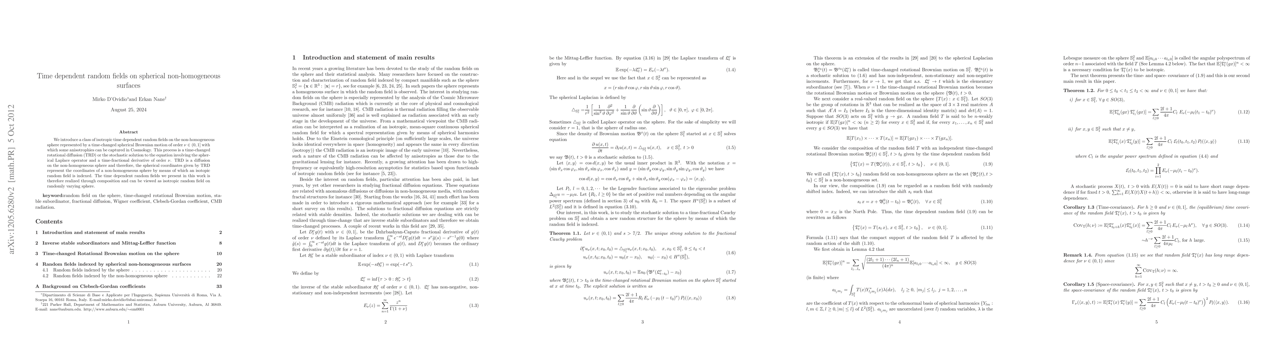 We introduce a class of isotropic time dependent random fields on the non-homogeneous sphere represented by a time-changed spherical Brownian motion of order \nu \in (0,1] with which some anisotrophies can be captured in Cosmology. This process is a time-changed rotational diffusion (TRD) or the stochastic solution to the equation involving the spherical Laplace operator and a time-fractional derivative of order \nu. TRD is a diffusion on the non-homogeneous sphere and therefore, the spherical coordinates given by TRD represent the coordinates of a non-homogeneous sphere by means of which an isotopic random field is indexed. The time dependent random fields we present in this work is therefore realized through composition and can be viewed as isotropic random field on randomly varying sphere.