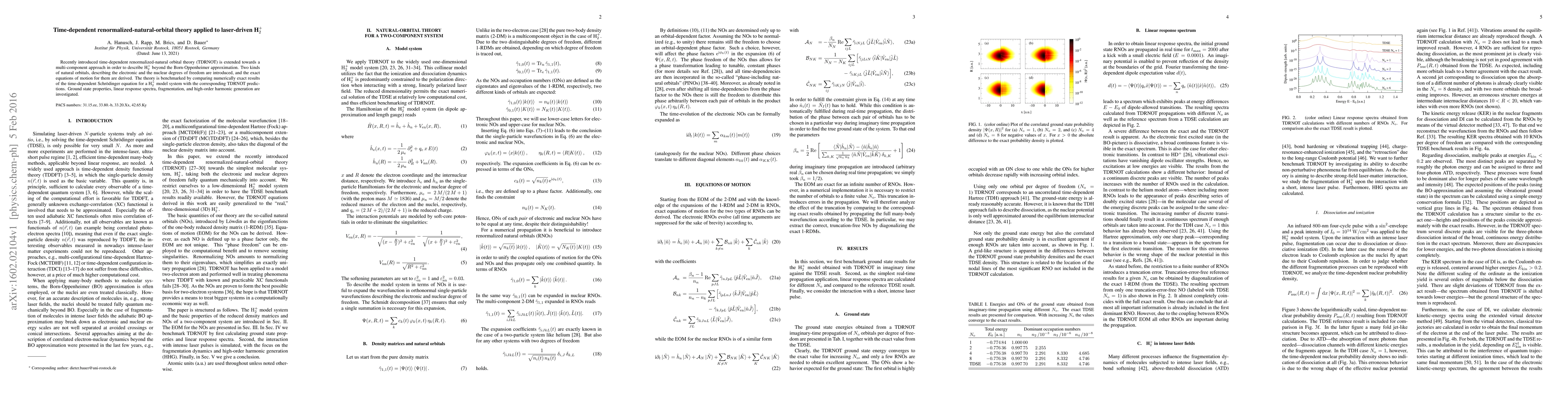Recently introduced time-dependent renormalized-natural orbital theory (TDRNOT) is extended towards a multi-component approach in order to describe H$_2^+$ beyond the Born-Oppenheimer approximation. Two kinds of natural orbitals, describing the electronic and the nuclear degrees of freedom are introduced, and the exact equations of motion for them are derived. The theory is benchmarked by comparing numerically exact results of the time-dependent Schr\"odinger equation for a H$_2^+$ model system with the corresponding TDRNOT predictions. Ground state properties, linear response spectra, fragmentation, and high-order harmonic generation are investigated.
