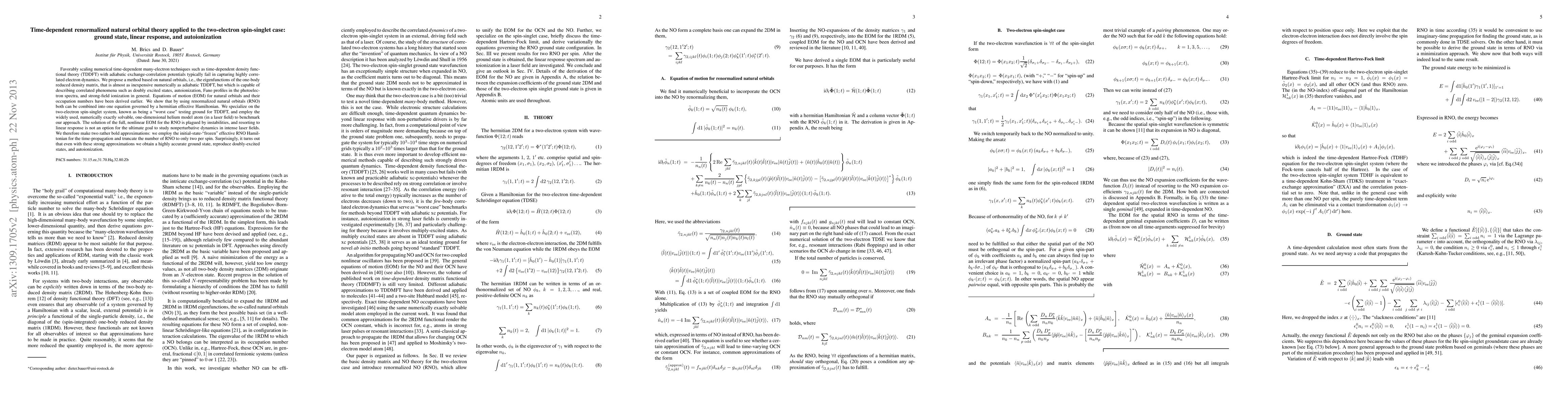Favorably scaling numerical time-dependent many-electron techniques such as time-dependent density functional theory (TDDFT) with adiabatic exchange-correlation potentials typically fail in capturing highly correlated electron dynamics. We propose a method based on natural orbitals, i.e., the eigenfunctions of the one-body reduced density matrix, that is almost as inexpensive numerically as adiabatic TDDFT, but which is capable of describing correlated phenomena such as doubly excited states, autoionization, Fano profiles in the photoelectron spectra, and strong-field ionization in general. Equations of motion (EOM) for natural orbitals and their occupation numbers have been derived earlier. We show that by using renormalized natural orbitals (RNO) both can be combined into one equation governed by a hermitian effective Hamiltonian. We specialize on the two-electron spin-singlet system, known as being a "worst case" testing ground for TDDFT, and employ the widely used, numerically exactly solvable, one-dimensional helium model atom (in a laser field) to benchmark our approach. The solution of the full, nonlinear EOM for the RNO is plagued by instabilities, and resorting to linear response is not an option for the ultimate goal to study nonperturbative dynamics in intense laser fields. We therefore make two rather bold approximations: we employ the initial-state-"frozen" effective RNO Hamiltonian for the time-propagation and truncate the number of RNO to only two per spin. Surprisingly, it turns out that even with these strong approximations we obtain a highly accurate ground state, reproduce doubly-excited states, and autoionization.