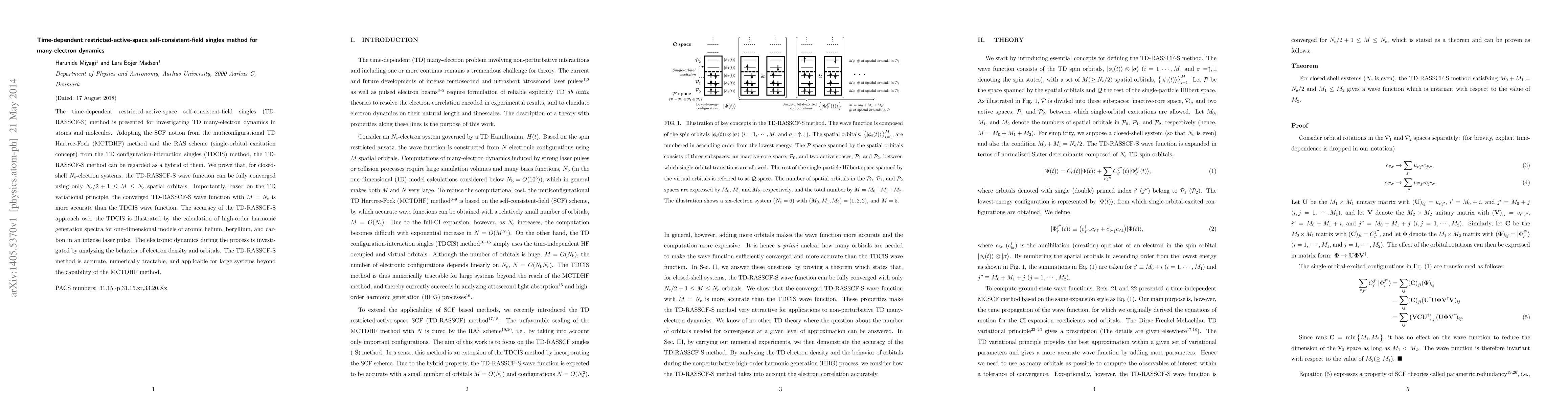 The time-dependent restricted-active-space self-consistent-field singles (TD-RASSCF-S) method is presented for investigating TD many-electron dynamics in atoms and molecules. Adopting the SCF notion from the muticonfigurational TD Hartree-Fock (MCTDHF) method and the RAS scheme (single-orbital excitation concept) from the TD configuration-interaction singles (TDCIS) method, the TD-RASSCF-S method can be regarded as a hybrid of them. We prove that, for closed-shell $N_{\rm e}$-electron systems, the TD-RASSCF-S wave function can be fully converged using only $N_{\rm e}/2+1\le M\le N_{\rm e}$ spatial orbitals. Importantly, based on the TD variational principle, the converged TD-RASSCF-S wave function with $M= N_{\rm e}$ is more accurate than the TDCIS wave function. The accuracy of the TD-RASSCF-S approach over the TDCIS is illustrated by the calculation of high-order harmonic generation spectra for one-dimensional models of atomic helium, beryllium, and carbon in an intense laser pulse. The electronic dynamics during the process is investigated by analyzing the behavior of electron density and orbitals. The TD-RASSCF-S method is accurate, numerically tractable, and applicable for large systems beyond the capability of the MCTDHF method.
