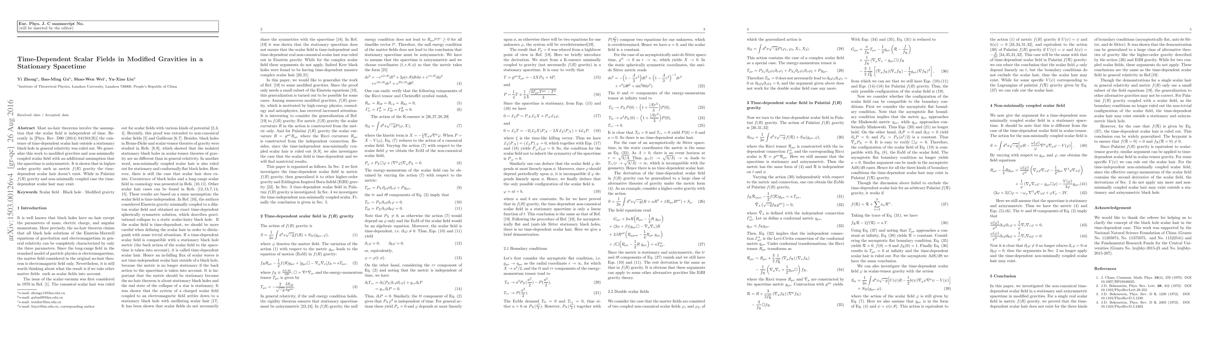 This paper generalizes the exclusion of time-dependent scalar hair outside a stationary black hole to modified gravities, showing that such hair does not exist in higher-order gravity like $f(R)$ gravity, but may exist in Palatini $f(R)$ gravity and non-minimally coupled cases. The analysis assumes axisymmetric spacetime.
