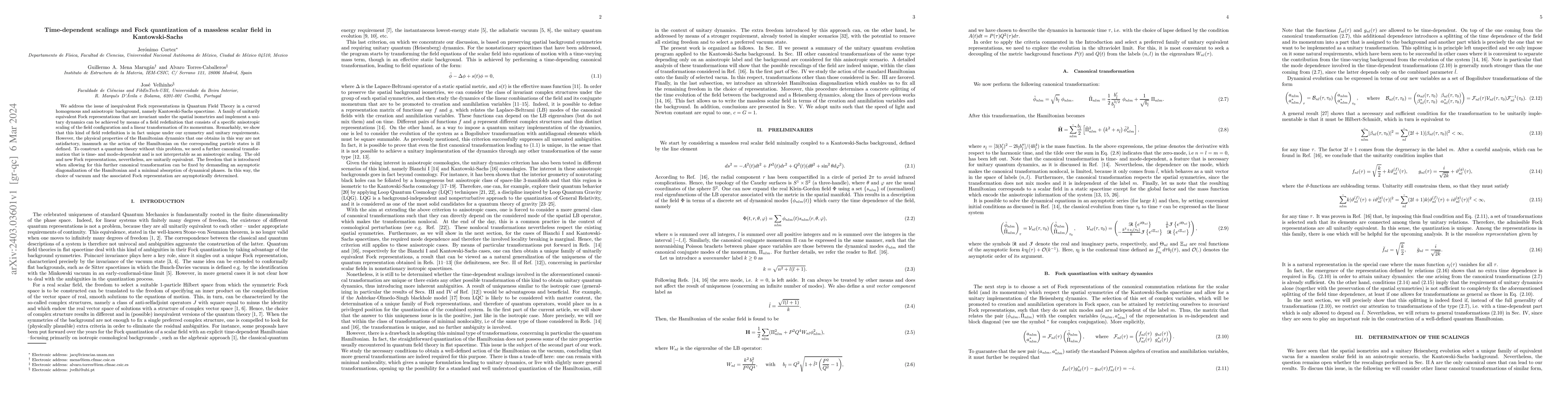 This paper investigates Fock quantization of a massless scalar field in Kantowski-Sachs spacetime, identifying a unique anisotropic scaling to achieve unitarily equivalent representations. However, the resulting Hamiltonian dynamics are ill-defined; thus, a time- and mode-dependent canonical transformation is required to construct a satisfactory quantum theory, with the final choice of vacuum determined by asymptotic diagonalization and minimal phase absorption.