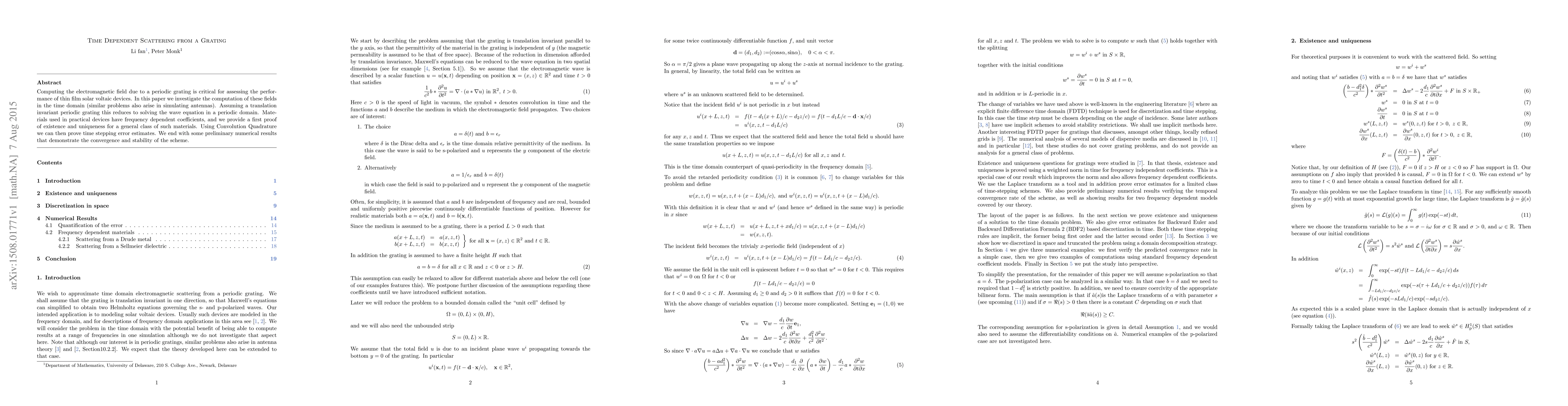 This paper investigates the time-dependent electromagnetic field scattering from a periodic grating, crucial for evaluating thin film solar devices. It establishes the existence and uniqueness of solutions for frequency-dependent materials and demonstrates the convergence and stability of a time-stepping scheme using Convolution Quadrature.