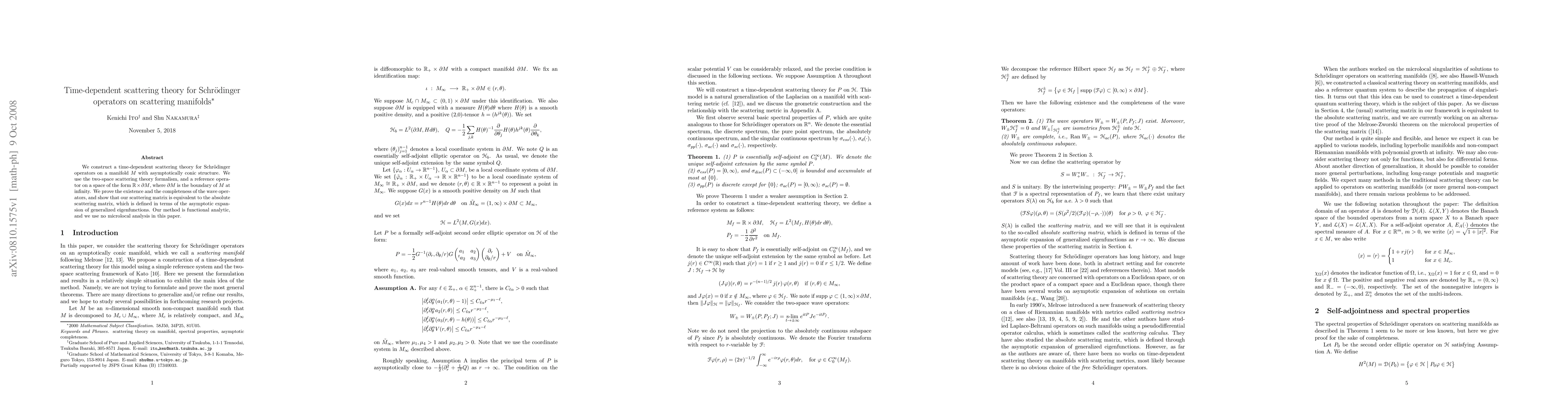 This paper constructs a time-dependent scattering theory for Schrödinger operators on manifolds with an asymptotically conic structure, proving the existence and completeness of wave operators and demonstrating the equivalence of the scattering matrix to the absolute scattering matrix defined via the asymptotic expansion of generalized eigenfunctions. The method is purely functional analytic without reliance on microlocal analysis.