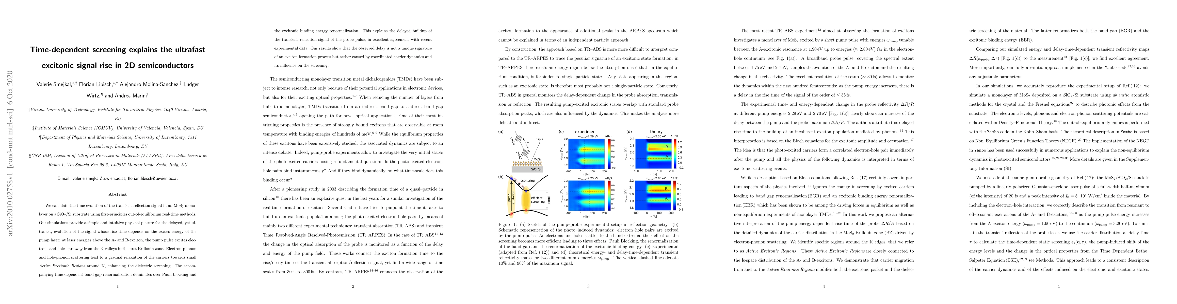 We calculate the time evolution of the transient reflection signal in an MoS$_2$ monolayer on a SiO$_2$/Si substrate using first-principles out-of-equilibrium real-time methods. Our simulations provide a simple and intuitive physical picture for the delayed, yet ultrafast, evolution of the signal whose rise time depends on the excess energy of the pump laser: at laser energies above the A- and B-exciton, the pump pulse excites electrons and holes far away from the K valleys in the first Brillouin zone. Electron-phonon and hole-phonon scattering lead to a gradual relaxation of the carriers towards small $\textit{Active Excitonic Regions}$ around K, enhancing the dielectric screening. The accompanying time-dependent band gap renormalization dominates over Pauli blocking and the excitonic binding energy renormalization. This explains the delayed buildup of the transient reflection signal of the probe pulse, in excellent agreement with recent experimental data. Our results show that the observed delay is not a unique signature of an exciton formation process but rather caused by coordinated carrier dynamics and its influence on the screening.
