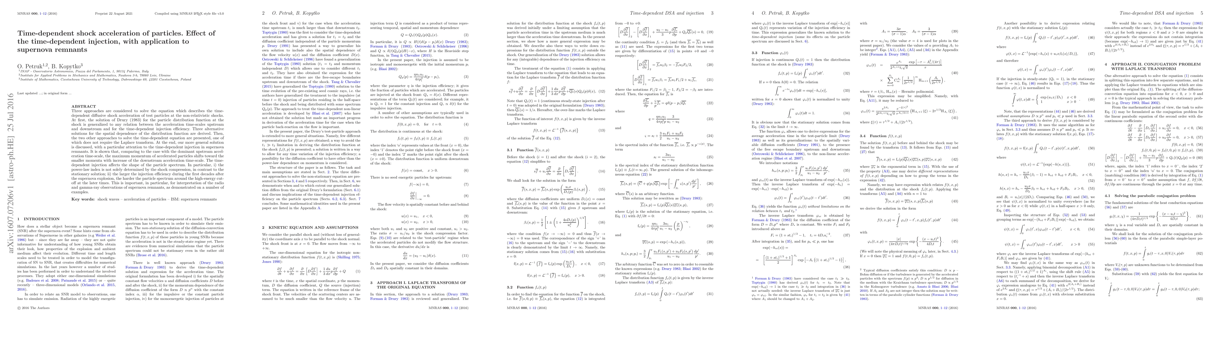 Three approaches are considered to solve the equation which describes the time-dependent diffusive shock acceleration of test particles at the non-relativistic shocks. At first, the solution of Drury (1983) for the particle distribution function at the shock is generalized to any relation between the acceleration time-scales upstream and downstream and for the time-dependent injection efficiency. Three alternative solutions for the spatial dependence of the distribution function are derived. Then, the two other approaches to solve the time-dependent equation are presented, one of which does not require the Laplace transform. At the end, our more general solution is discussed, with a particular attention to the time-dependent injection in supernova remnants. It is shown that, comparing to the case with the dominant upstream acceleration time-scale, the maximum momentum of accelerated particles shifts toward the smaller momenta with increase of the downstream acceleration time-scale. The time-dependent injection affects the shape of the particle spectrum. In particular, i) the power-law index is not solely determined by the shock compression, in contrast to the stationary solution; ii) the larger the injection efficiency during the first decades after the supernova explosion, the harder the particle spectrum around the high-energy cutoff at the later times. This is important, in particular, for interpretation of the radio and gamma-ray observations of supernova remnants, as demonstrated on a number of examples.