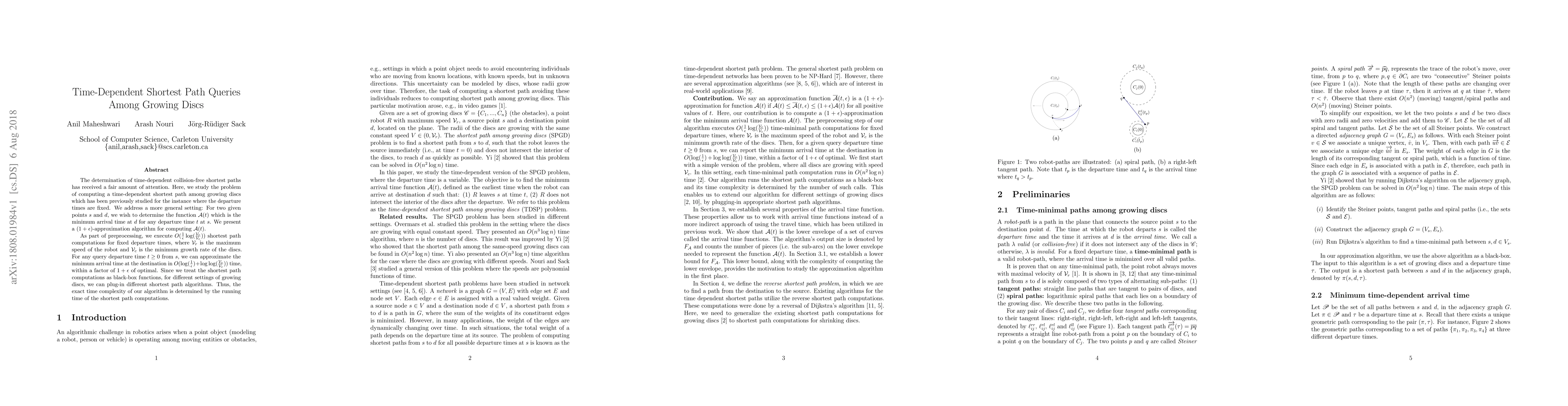 This paper presents a $(1+\epsilon)$-approximation algorithm for computing time-dependent shortest paths among growing discs, addressing a more general setting than previously studied. The algorithm involves preprocessing and can approximate the minimum arrival time for any query departure time within a factor of $1+\epsilon$.