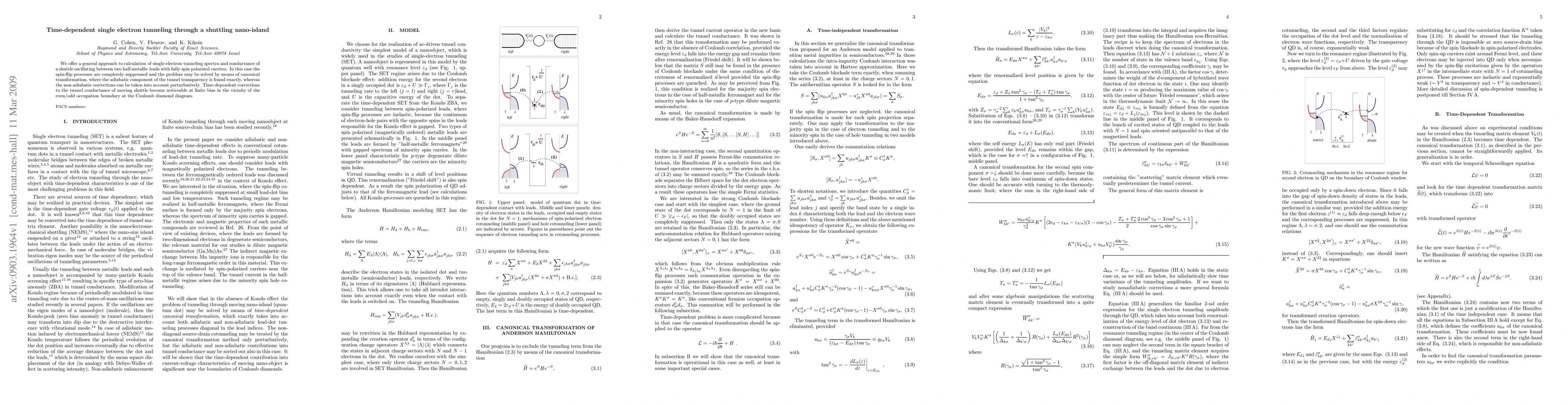 We offer a general approach to calculation of single-electron tunneling spectra and conductance of a shuttle oscillating between two half-metallic leads with fully spin polarized carriers. In this case the spin-flip processes are completely suppressed and the problem may be solved by means of canonical transformation, where the adiabatic component of the tunnel transparency is found exactly, whereas the non-adiabatic corrections can be taken into account perturbatively. Time-dependent corrections to the tunnel conductance of moving shuttle become noticeable at finite bias in the vicinity of the even/odd occupation boundary at the Coulomb diamond diagram.