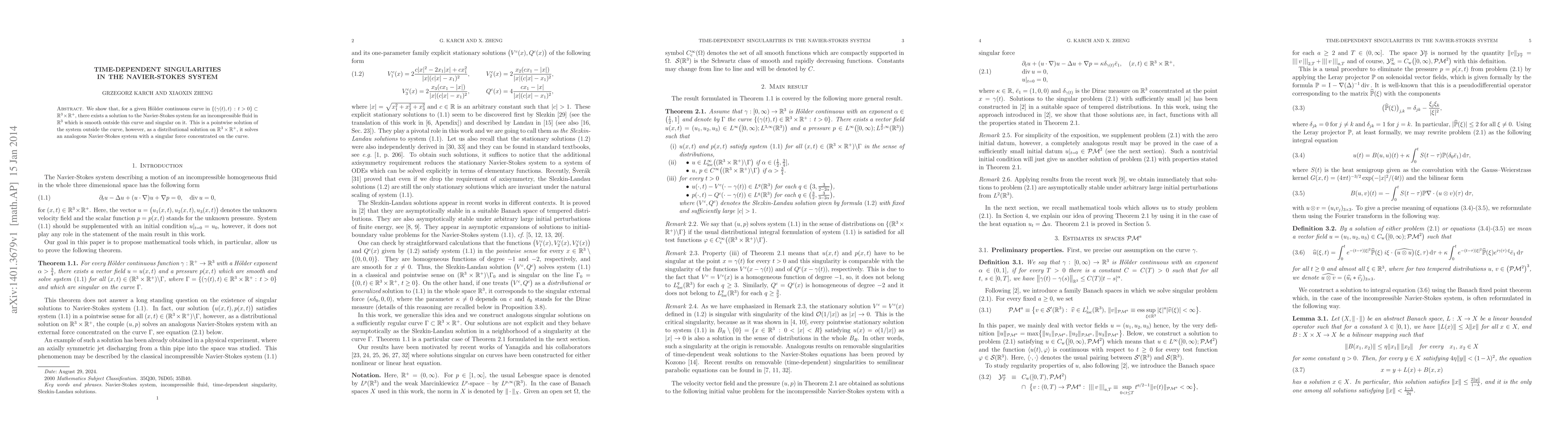We show that, for a given H\"older continuous curve in $\{(\gamma(t),t)\,:\, t>0\} \subset R^3\times R^+$, there exists a solution to the Navier-Stokes system for an incompressible fluid in $R^3$ which is smooth outside this curve and singular on it. This is a pointwise solution of the system outside the curve, however, as a distributional solution on $R^3\times R^+$, it solves an analogous Navier-Stokes system with a singular force concentrated on the curve.