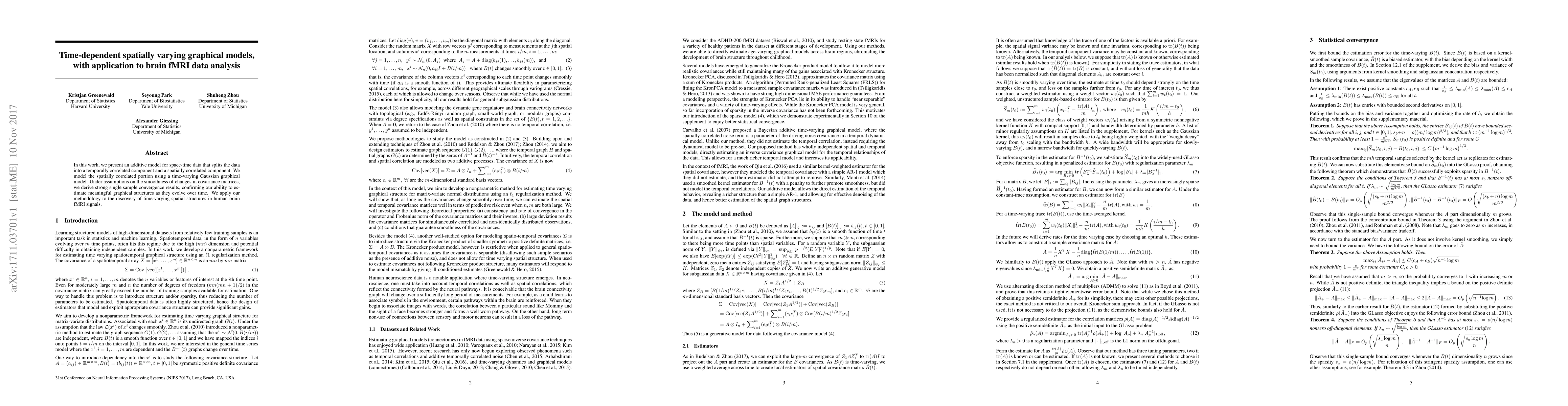 In this work, we present an additive model for space-time data that splits the data into a temporally correlated component and a spatially correlated component. We model the spatially correlated portion using a time-varying Gaussian graphical model. Under assumptions on the smoothness of changes in covariance matrices, we derive strong single sample convergence results, confirming our ability to estimate meaningful graphical structures as they evolve over time. We apply our methodology to the discovery of time-varying spatial structures in human brain fMRI signals.
