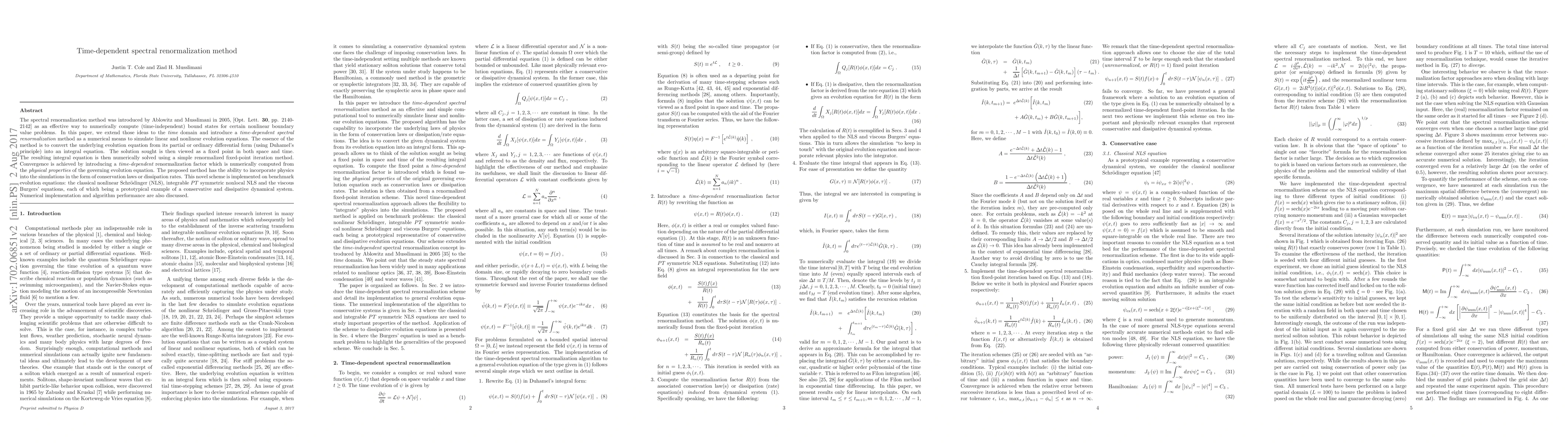 This paper introduces a time-dependent spectral renormalization method to numerically simulate linear and nonlinear evolution equations by converting them into an integral equation viewed as a fixed point in space and time. The method incorporates physics through conservation laws or dissipation rates and is demonstrated on benchmark equations like the nonlinear Schrödinger and viscous Burgers' equations.