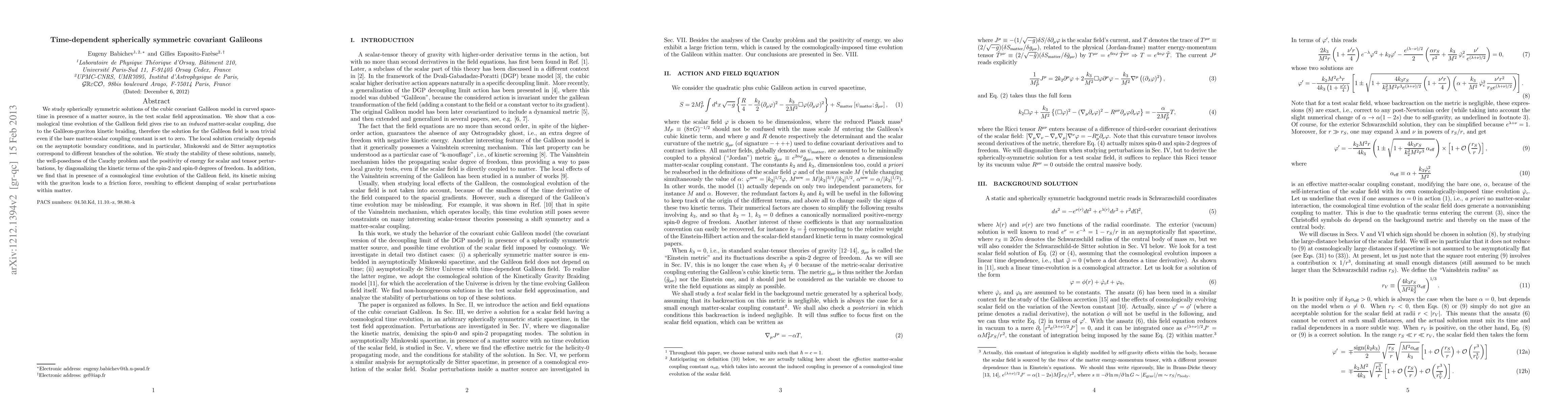 Research on spherically symmetric solutions of a Galileon model in curved spacetime reveals non-trivial effects from cosmological time evolution, including induced matter-scalar coupling and damping of scalar perturbations due to kinetic mixing with gravitons.