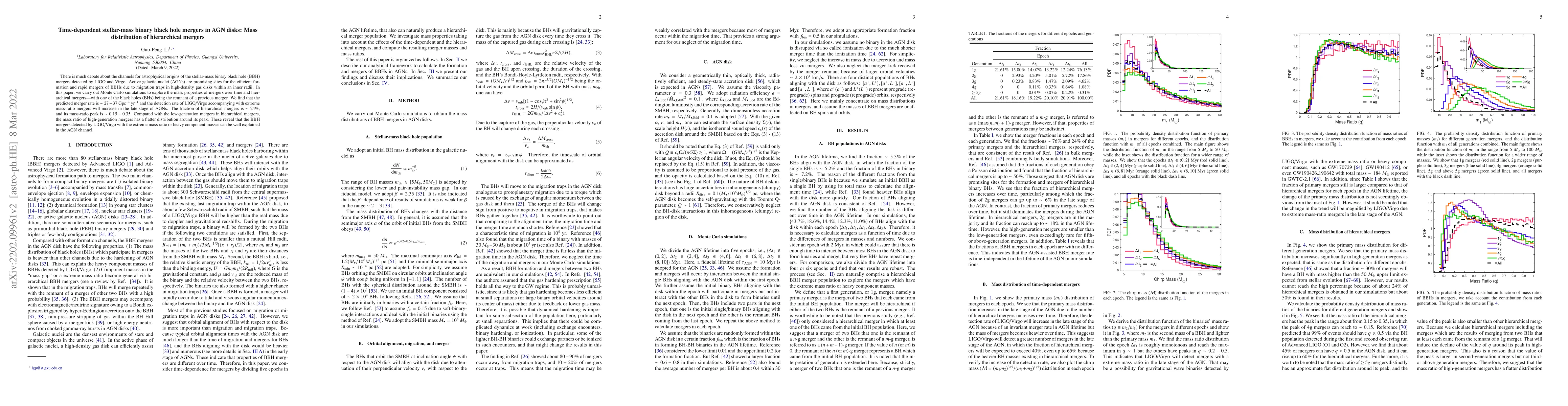 This paper uses Monte Carlo simulations to investigate the mass distribution and properties of stellar-mass binary black hole mergers in active galactic nuclei (AGN) disks, finding a predicted merger rate of $\sim 27-37~{\rm Gpc^{-3}~yr^{-1}}$ and a $\sim 24\%$ fraction of hierarchical mergers, suggesting AGNs as a viable formation site for such mergers.