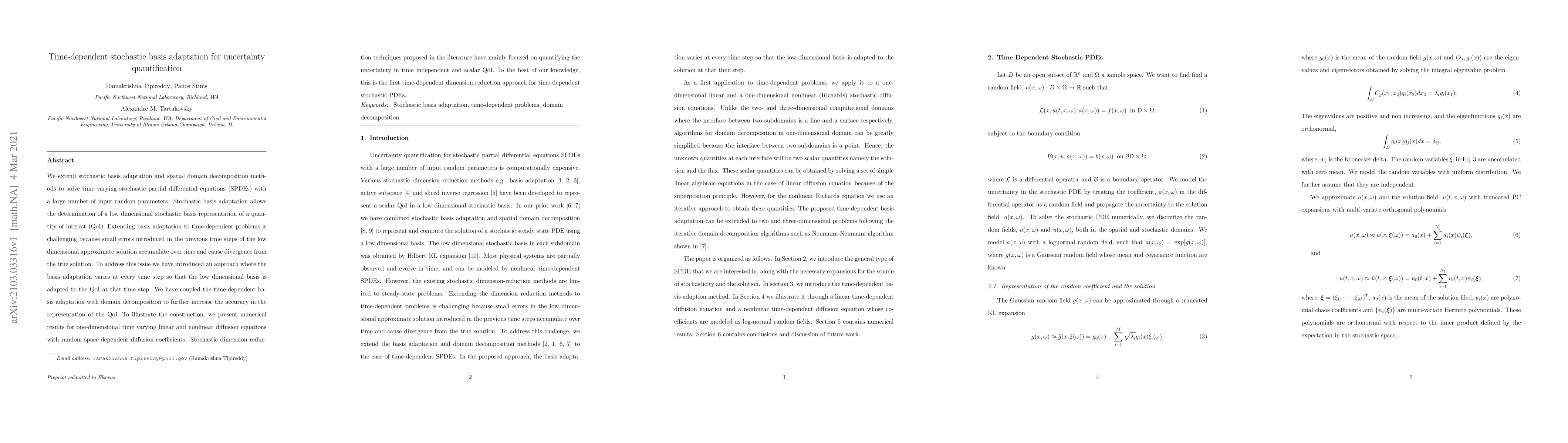 This paper proposes a time-dependent stochastic basis adaptation method to solve time-varying stochastic partial differential equations with numerous input random parameters, addressing the accumulation of errors over time. The method adapts the basis at each time step and combines it with domain decomposition to enhance accuracy, demonstrated through numerical results for one-dimensional diffusion equations.