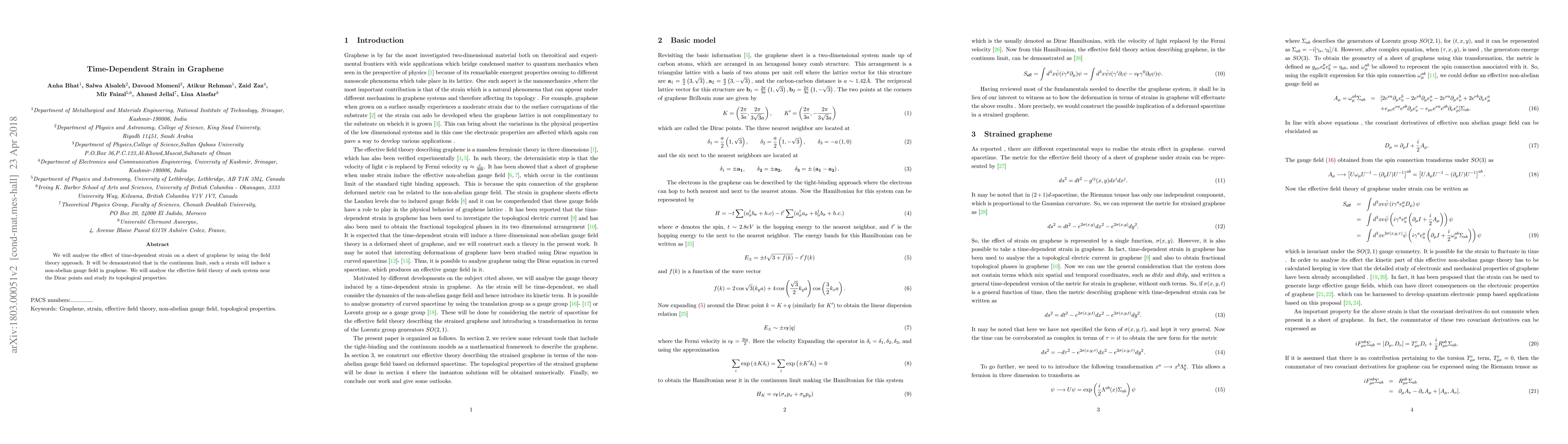 We will analyse the effect of time-dependent strain on a sheet of graphene by using the field theory approach. It will be demonstrated that in the continuum limit, such a strain will induce a non-abelian gauge field in graphene. We will analyse the effective field theory of such system near the Dirac points and study its topological properties.