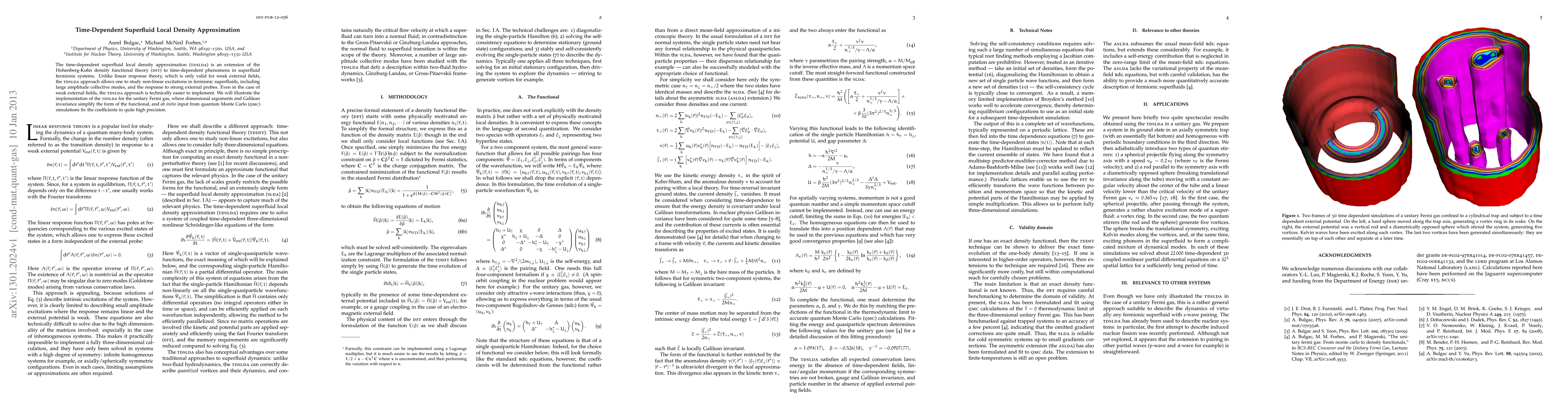 The time-dependent superfluid local density approximation (TDSLDA) extends Hohenberg-Kohn DFT to study non-linear excitations in superfluid fermionic systems, offering a more versatile approach than linear response theory. The TDSLDA is demonstrated for the unitary Fermi gas, leveraging dimensional arguments and ab initio input for precise coefficient determination.