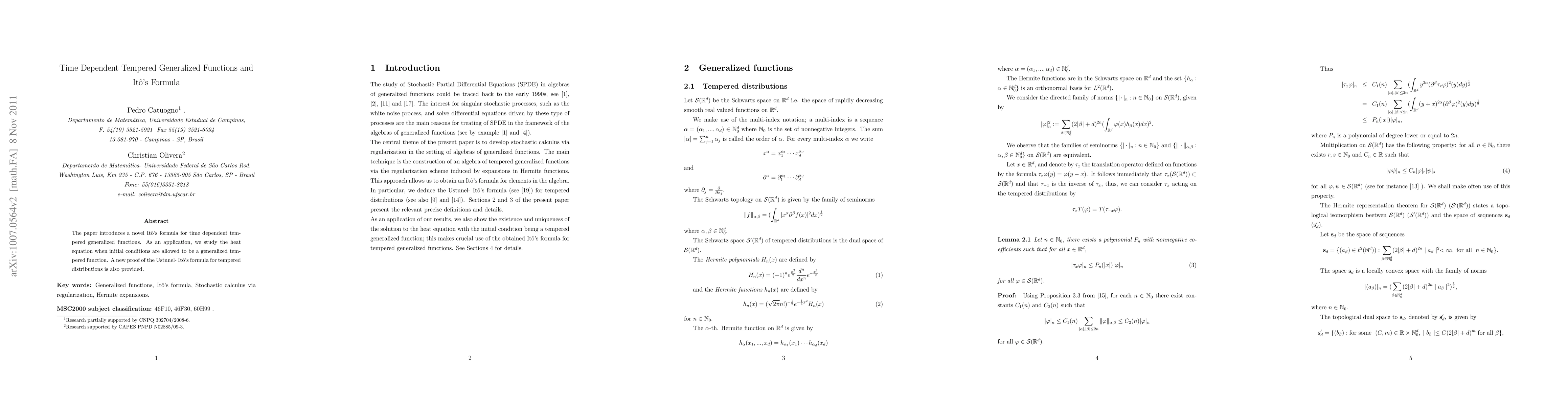 The paper introduces a novel Ito's formula for time dependent tempered generalized functions. As an application, we study the heat equation when initial conditions are allowed to be a generalized tempered function. A new proof of the Ustunel- Ito's formula for tempered distributions is also provided.
