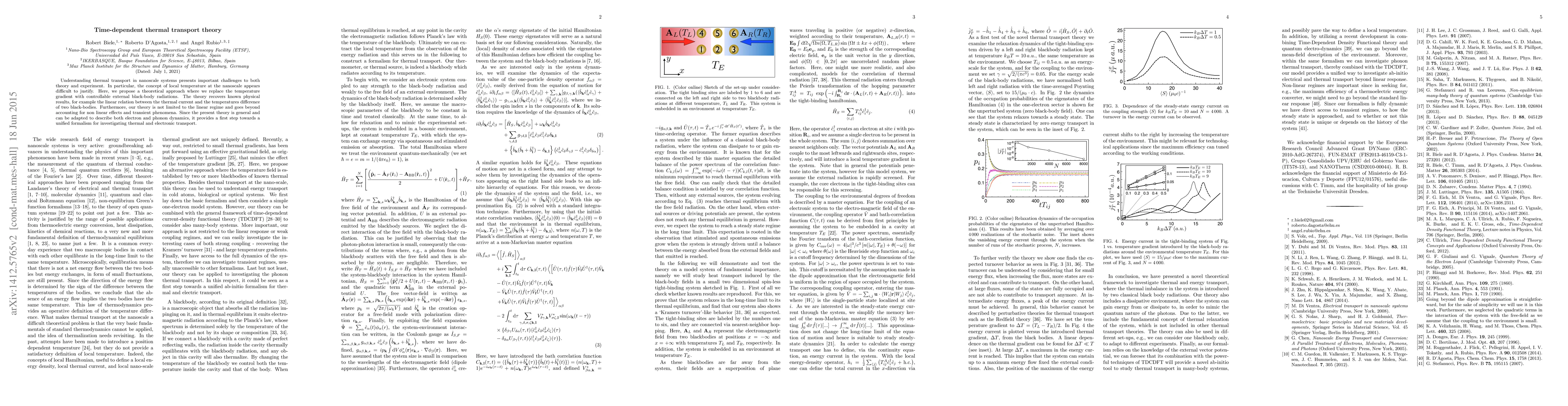 Understanding thermal transport in nanoscale systems presents important challenges to both theory and experiment. In particular, the concept of local temperature at the nanoscale appears difficult to justify. Here, we propose a novel theoretical approach where we replace the temperature gradient with controllable external black-body radiations. The theory recovers known physical results, for example the linear relation between the thermal current and the temperatures difference of two black-bodies. Furthermore, our theory is not limited to the linear regime and goes beyond accounting for non linear effects and transient phenomena. In the strong coupling and large temperature gradients, we show that there is a maximum energy current that the system can sustain and we recover the Kramers' turnover. Since the present theory is general and can be adapted to describe both electron and phonon dynamics, it provides a first step towards a unified formalism for investigating thermal and electronic transport.