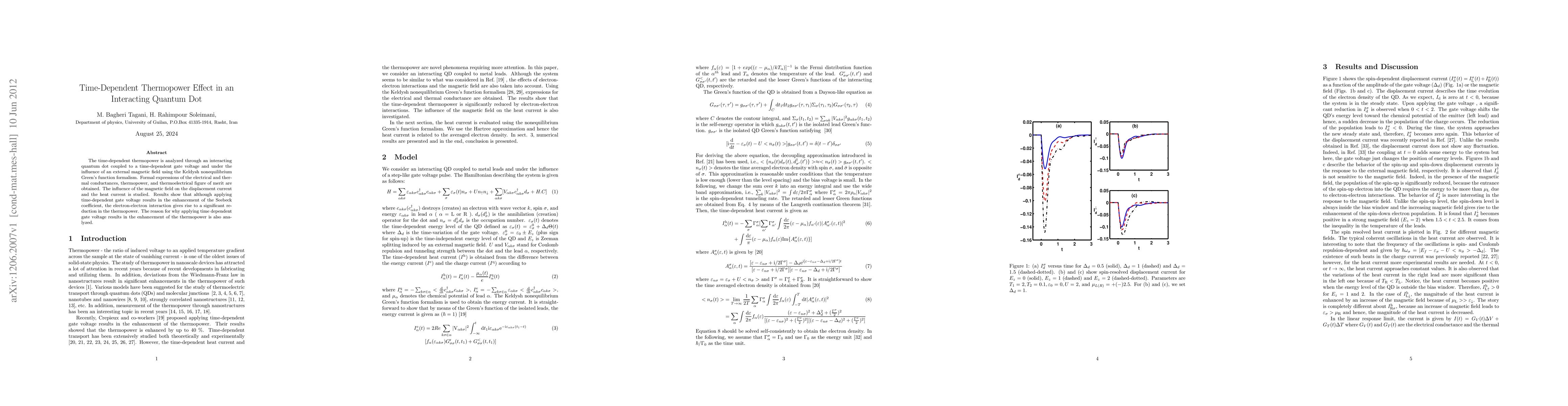 This paper investigates the time-dependent thermopower in an interacting quantum dot under varying gate voltage and magnetic field using the Keldysh formalism. It finds that while time-dependent gate voltage boosts the Seebeck coefficient, electron-electron interactions significantly reduce the overall thermopower.