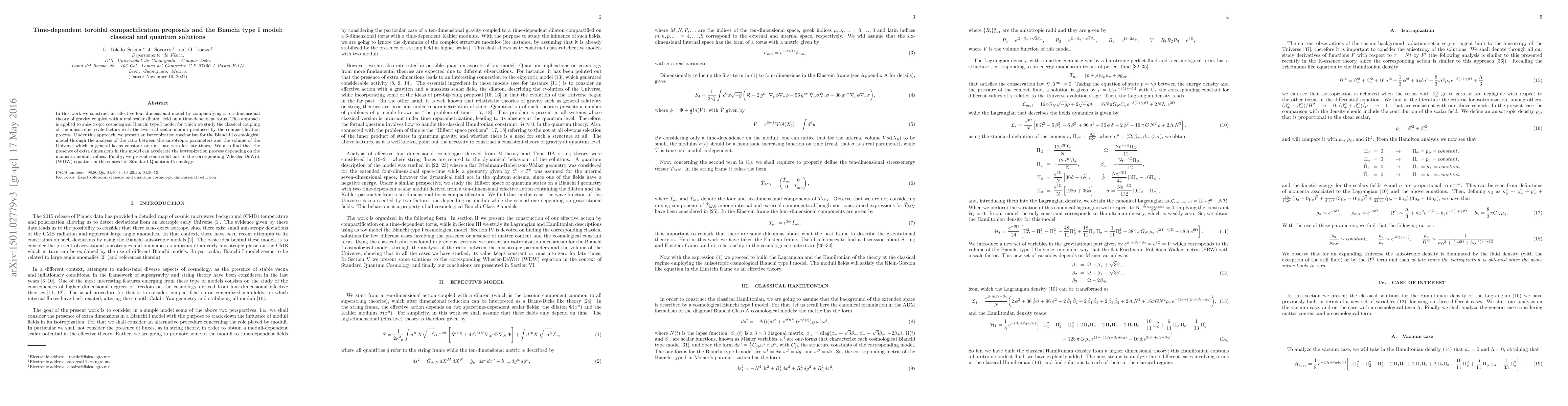 In this work we construct an effective four-dimensional model by compactifying a ten-dimensional theory of gravity coupled with a real scalar dilaton field on a time-dependent torus. This approach is applied to anisotropic cosmological Bianchi type I model for which we study the classical coupling of the anisotropic scale factors with the two real scalar moduli produced by the compactification process. Under this approach, we present an isotropization mechanism for the Bianchi I cosmological model through the analysis of the ratio between the anisotropic parameters and the volume of the Universe which in general keeps constant or runs into zero for late times. We also find that the presence of extra dimensions in this model can accelerate the isotropization process depending on the momenta moduli values. Finally, we present some solutions to the corresponding Wheeler-DeWitt (WDW) equation in the context of Standard Quantum Cosmology.