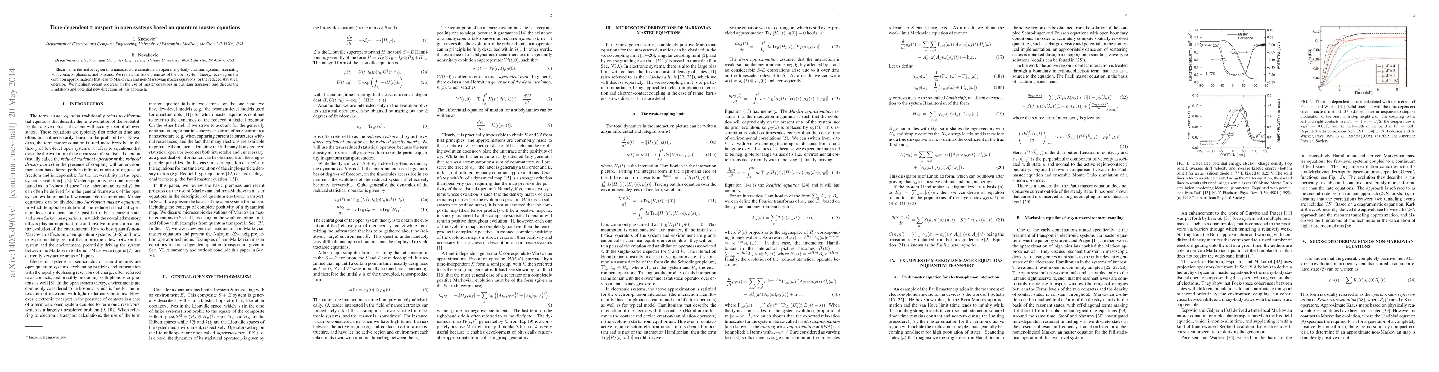 Electrons in the active region of a nanostructure constitute an open many-body quantum system, interacting with contacts, phonons, and photons. We review the basic premises of the open system theory, focusing on the common approximations that lead to Markovian and non-Markovian master equations for the reduced statistical operator. We highlight recent progress on the use of master equations in quantum transport, and discuss the limitations and potential new directions of this approach.