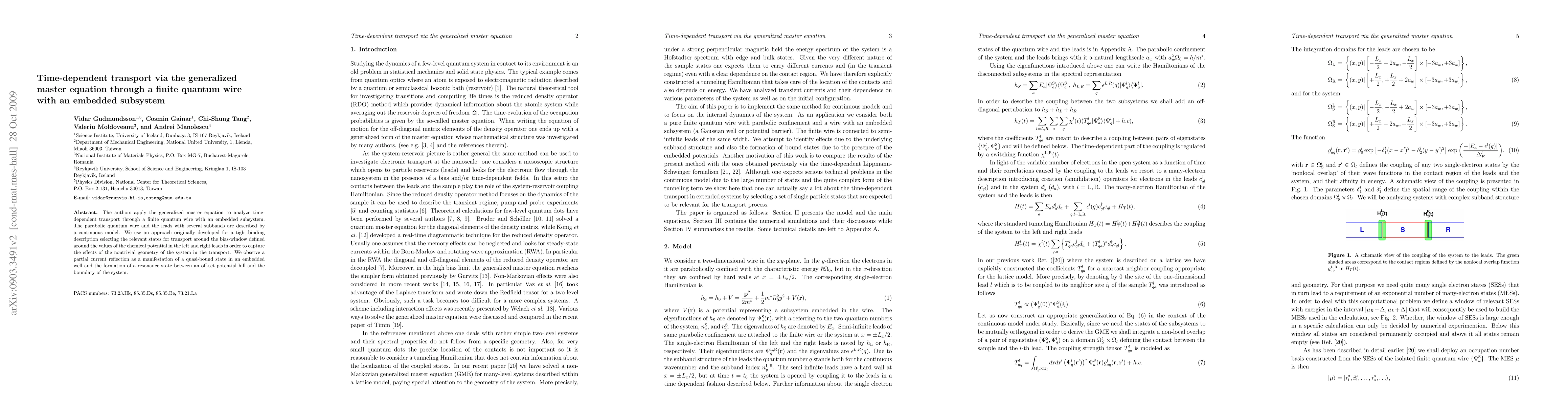 This paper uses the generalized master equation to study time-dependent transport in a finite quantum wire with an embedded subsystem, revealing partial current reflection due to a quasi-bound state and a resonance state formed by an off-set potential hill. The analysis focuses on relevant states within the bias-window to account for the system's complex geometry.