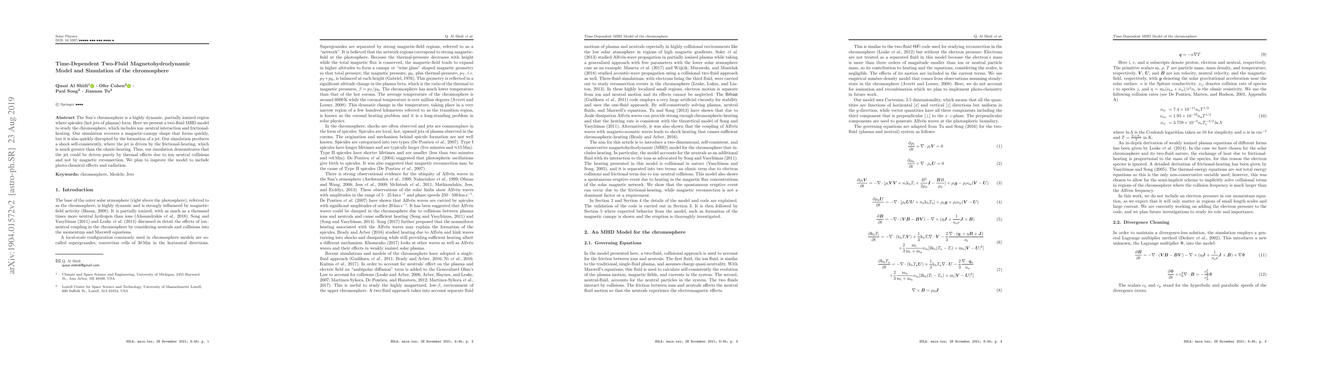 The sun's chromosphere is a highly dynamic, partially-ionized region where spicules (hot jets of plasma) form. Here we present a two-fluid MHD model to study the chromosphere, which includes ion-neutral interaction and frictional heating. Our simulation recovers a magnetic canopy shape that forms quickly, but is also quickly disrupted by the formation of a jet. Our simulation produces a shock self-consistently, where the jet is driven by the frictional heating, which is much greater than the ohmic heating. Thus, our simulation demonstrates that the jet could be driven purely by thermal effects due to ion-neutral collisions and not by magnetic reconnection. We plan to improve the model to include photo-chemical effects and radiation.