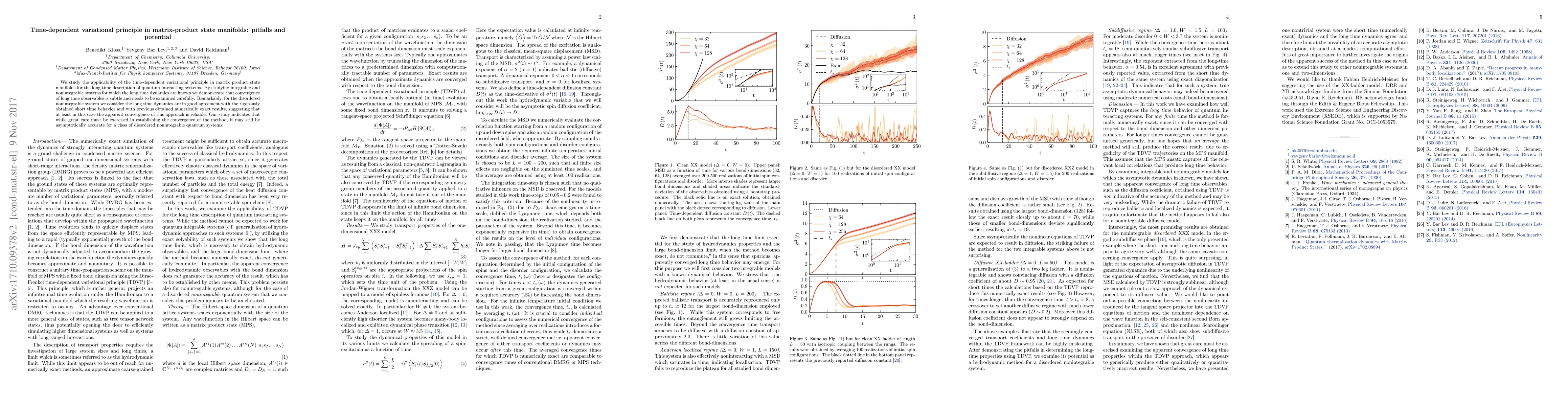 This paper investigates the time-dependent variational principle within matrix-product state manifolds for long-time quantum dynamics, finding that convergence is delicate and requires careful scrutiny. For a disordered nonintegrable system, the method shows promising asymptotic accuracy, aligning well with short-time behavior and numerically exact results.