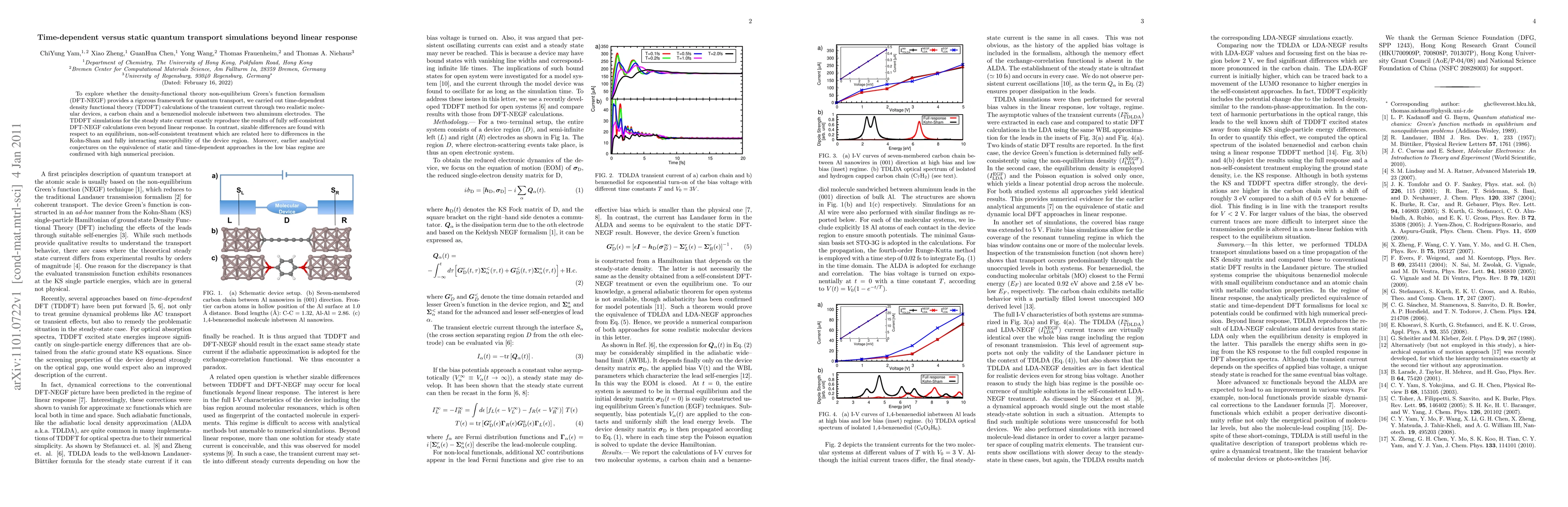 To explore whether the density-functional theory non-equilibrium Green's function formalism (DFT-NEGF) provides a rigorous framework for quantum transport, we carried out time-dependent density functional theory (TDDFT) calculations of the transient current through two realistic molecular devices, a carbon chain and a benzenediol molecule inbetween two aluminum electrodes. The TDDFT simulations for the steady state current exactly reproduce the results of fully self-consistent DFT-NEGF calculations even beyond linear response. In contrast, sizable differences are found with respect to an equilibrium, non-self-consistent treatment which are related here to differences in the Kohn-Sham and fully interacting susceptibility of the device region. Moreover, earlier analytical conjectures on the equivalence of static and time-dependent approaches in the low bias regime are confirmed with high numerical precision.