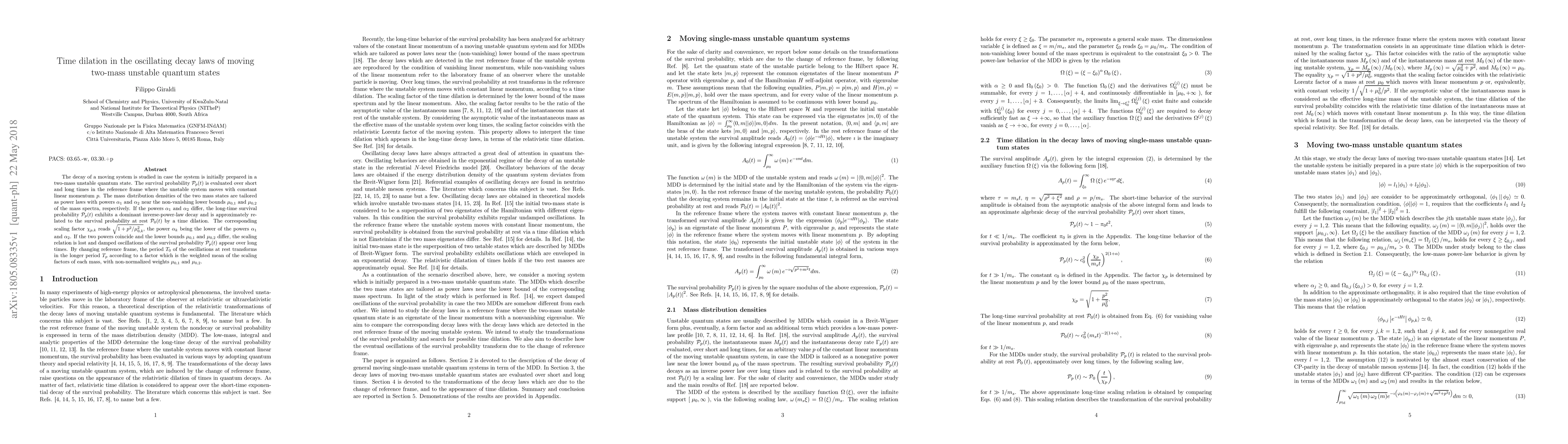 This paper investigates the decay dynamics of a moving two-mass unstable quantum system prepared in a specific quantum state, revealing time dilation effects in the decay law. When the decay powers differ, the long-time decay follows an inverse-power-law with a scaling factor dependent on momentum, while identical decay powers and differing lower mass bounds lead to damped oscillations.