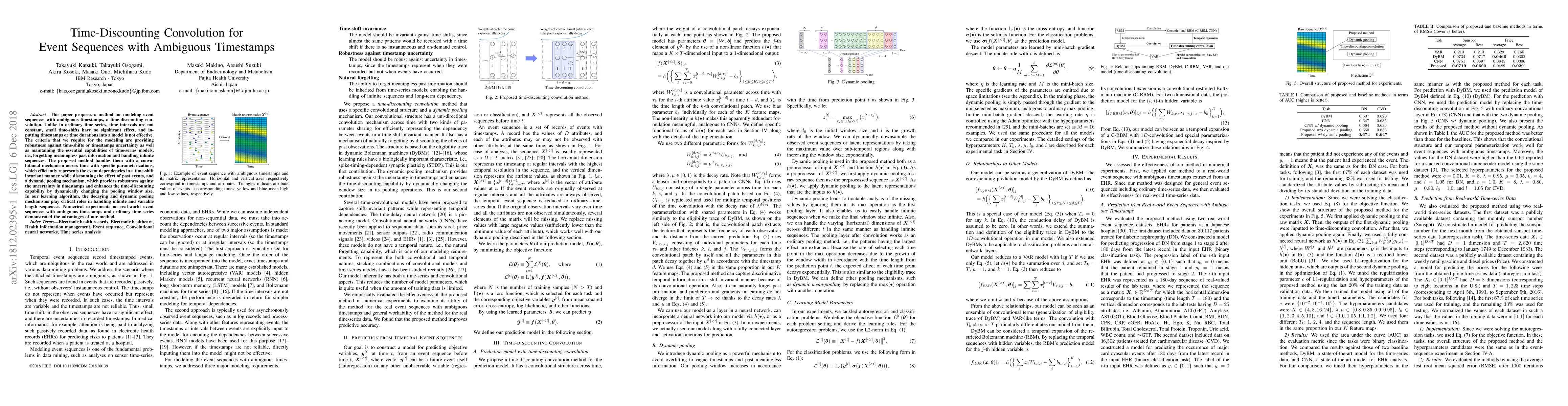This paper introduces a time-discounting convolution method to model event sequences with ambiguous timestamps, emphasizing robustness against time-shifts and maintaining time-series capabilities. The proposed approach leverages convolutional mechanisms and dynamic pooling to handle variable time intervals and infinite sequences effectively.
