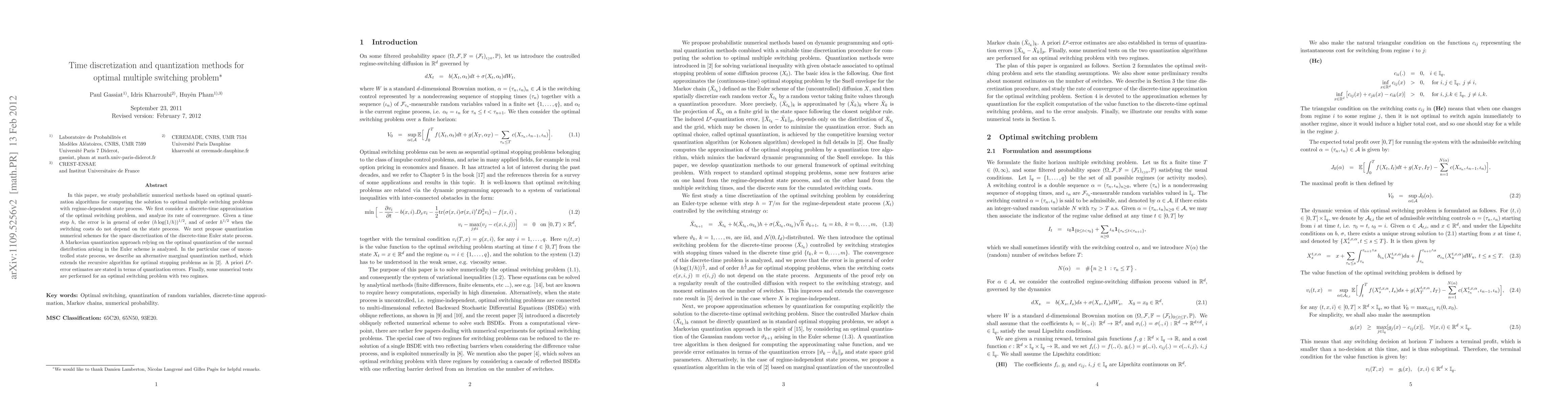 In this paper, we study probabilistic numerical methods based on optimal quantization algorithms for computing the solution to optimal multiple switching problems with regime-dependent state process. We first consider a discrete-time approximation of the optimal switching problem, and analyze its rate of convergence. Given a time step $h$, the error is in general of order $(h \log(1/h))^{1/2}$, and of order $h^{1/2}$ when the switching costs do not depend on the state process. We next propose quantization numerical schemes for the space discretization of the discrete-time Euler state process. A Markovian quantization approach relying on the optimal quantization of the normal distribution arising in the Euler scheme is analyzed. In the particular case of uncontrolled state process, we describe an alternative marginal quantization method, which extends the recursive algorithm for optimal stopping problems as in Bally-Pag\`es (2003). A priori $L^p$-error estimates are stated in terms of quantization errors. Finally, some numerical tests are performed for an optimal switching problem with two regimes.