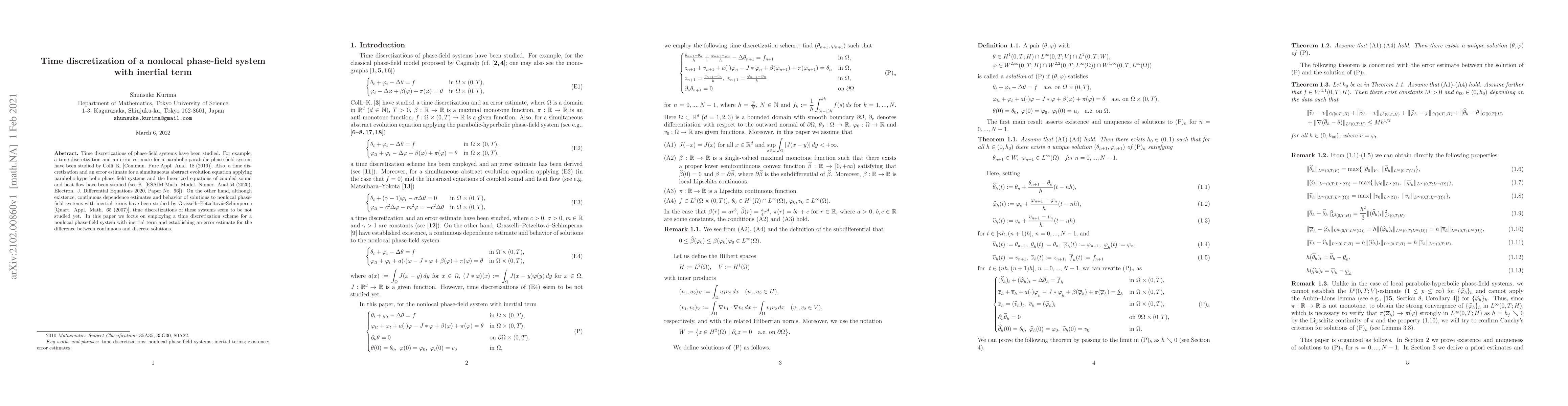 Time discretizations of phase-field systems have been studied. For example, a time discretization and an error estimate for a parabolic-parabolic phase-field system have been studied by Colli--K. [Commun. Pure Appl. Anal. 18 (2019)]. Also, a time discretization and an error estimate for a simultaneous abstract evolution equation applying parabolic-hyperbolic phase field systems and the linearized equations of coupled sound and heat flow have been studied (see K. [ESAIM Math. Model. Numer. Anal.54 (2020), Electron. J. Differential Equations 2020, Paper No. 96]). On the other hand, although existence, continuous dependence estimates and behavior of solutions to nonlocal phase-field systems with inertial terms have been studied by Grasselli--Petzeltov\'a--Schimperna [Quart. Appl. Math. 65 (2007)], time discretizations of these systems seem to be not studied yet. In this paper we focus on employing a time discretization scheme for a nonlocal phase-field system with inertial term and establishing an error estimate for the difference between continuous and discrete solutions.