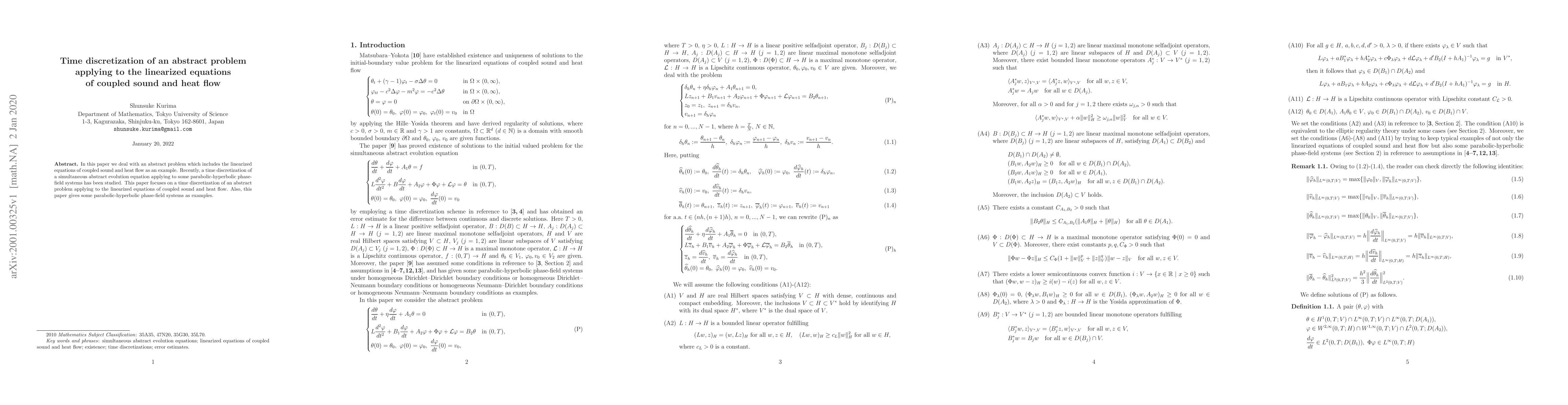 In this paper we deal with an abstract problem which includes the linearized equations of coupled sound and heat flow as an example. Recently, a time discretization of a simultaneous abstract evolution equation applying to some parabolic-hyperbolic phase-field systems has been studied. This paper focuses on a time discretization of an abstract problem applying to the linearized equations of coupled sound and heat flow. Also, this paper gives some parabolic-hyperbolic phase-field systems as examples.