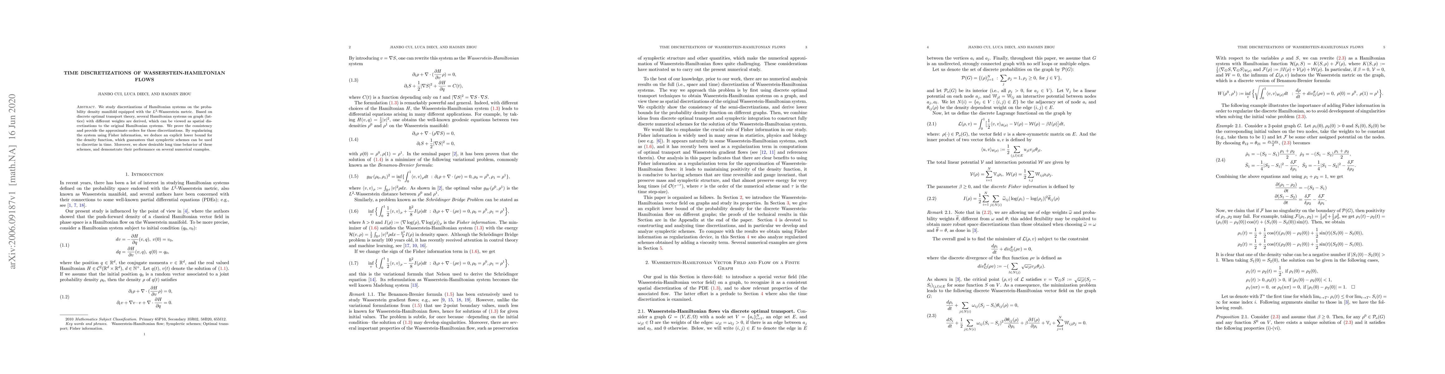 This paper investigates time discretizations for Hamiltonian systems defined on the probability density manifold using the $L^2$-Wasserstein metric. It derives spatial discretizations based on discrete optimal transport theory and proves their consistency and approximate orders, while demonstrating the effectiveness of symplectic schemes for time discretization through regularization with Fisher information.