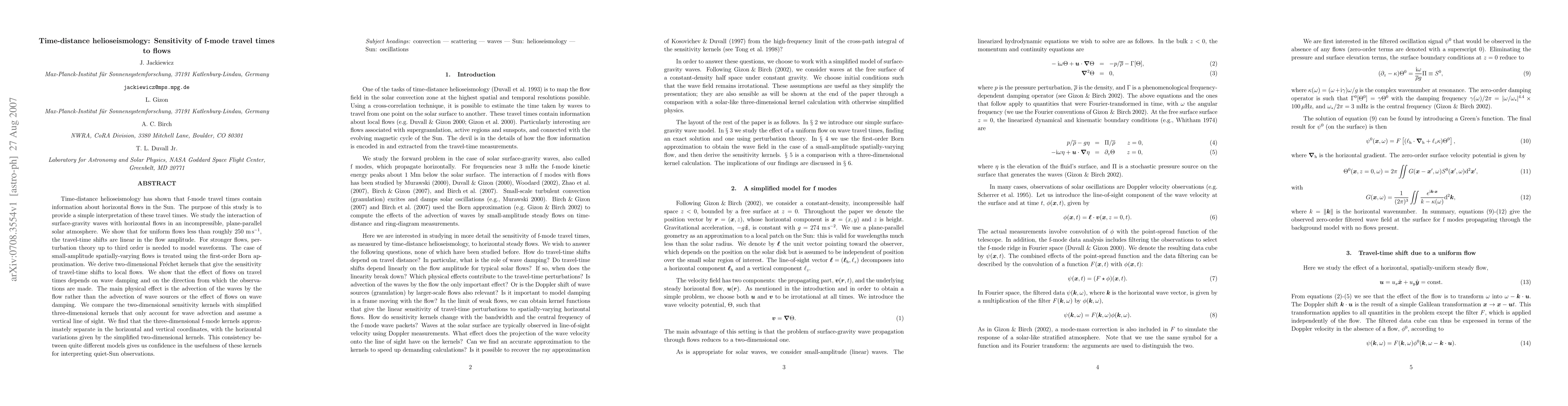 This study investigates how f-mode travel times in time-distance helioseismology are affected by horizontal solar flows, showing that for low-speed flows, travel-time shifts are linearly proportional to flow amplitude. It derives two-dimensional Fréchet kernels to interpret these shifts, confirming that wave advection by flows is the main effect, and validates these kernels against simplified three-dimensional models.
