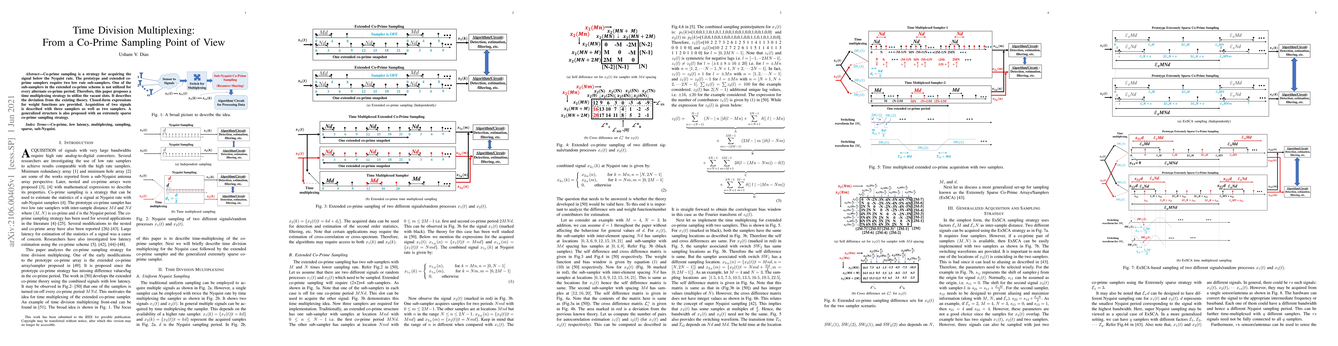 Co-prime sampling is a strategy for acquiring the signal below the Nyquist rate. The prototype and extended co-prime samplers require two low rate sub-samplers. One of the sub-samplers in the extended co-prime scheme is not utilized for every alternate co-prime period. Therefore, this paper proposes a time multiplexing strategy to utilize the vacant slots. It describes the deviation from the existing theory. Closed-form expressions for weight functions are provided. Acquisition of two signals is described with three samplers as well as two samplers. A generalized structure is also proposed with an extremely sparse co-prime sampling strategy.