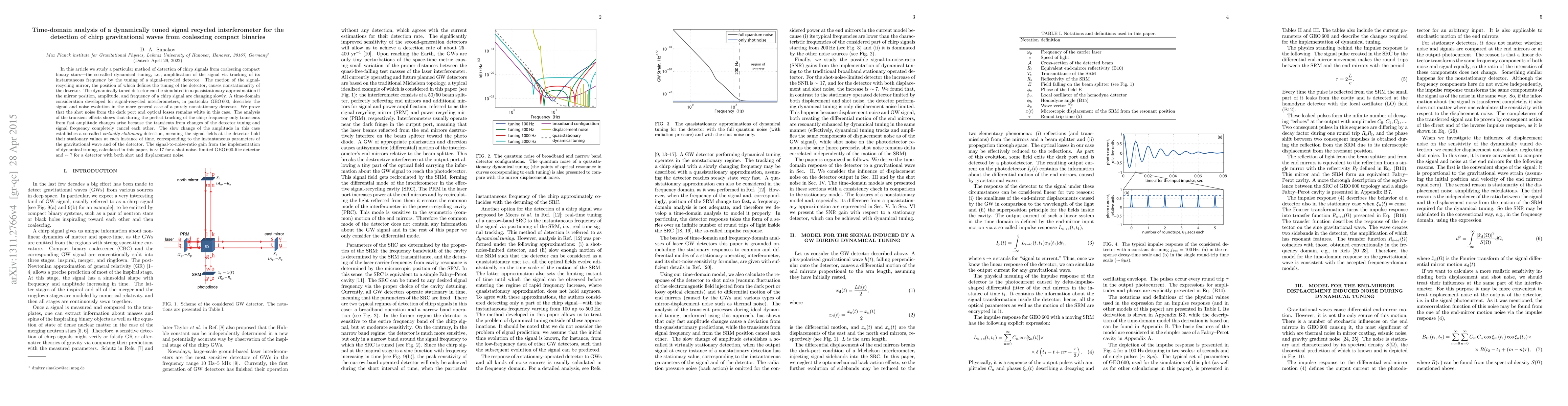 In this article we study a particular method of detection of chirp signals from coalescing compact binary stars -- the so-called dynamical tuning, i.e. amplification of the signal via tracking of its instantaneous frequency by the tuning of the signal-recycled detector. A time-domain consideration developed for signal-recycled interferometers, in particular GEO 600, describes the signal and noise evolution in the non-stationary detector. Its non-stationarity is caused by motion of the signal recycling mirror, whose position defines the tuning of the detector. We prove that the shot noise from the dark port and optical losses remains white. The analysis of the transient effects shows that during the perfect tracking of the chirp frequency only transients from amplitude changes arise. The signal-to-noise-ratio gain, calculated in this paper, is ~ 16 for a shot-noise limited detector and ~ 4 for a detector with thermal noise.
