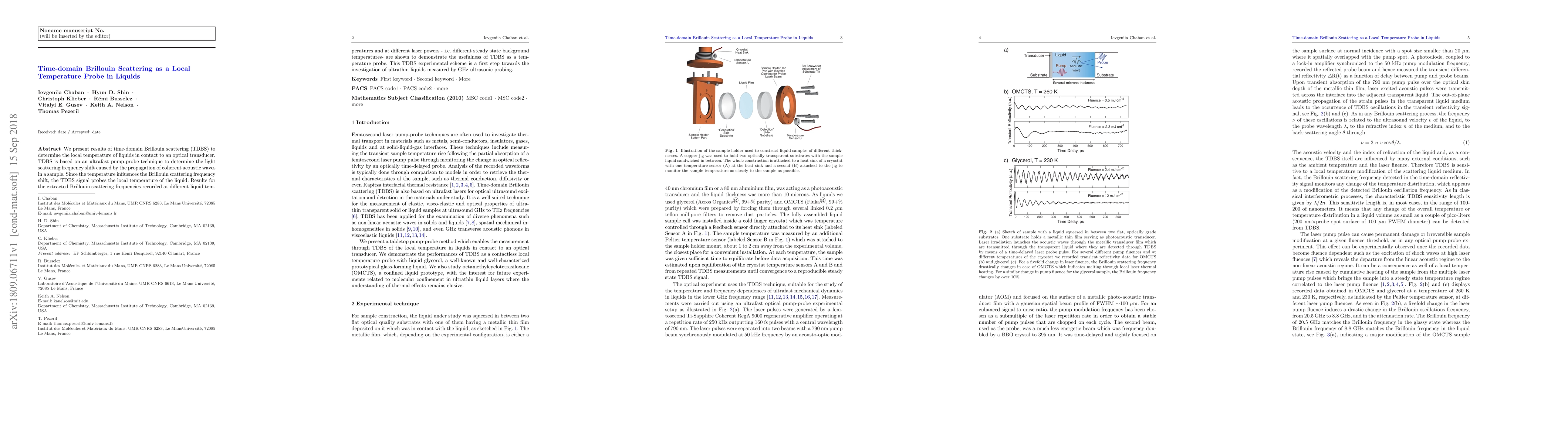 This paper demonstrates the use of time-domain Brillouin scattering (TDBS) as an ultrafast technique to measure local temperature in liquids by analyzing the frequency shift caused by coherent acoustic waves. The TDBS method shows potential for probing ultrathin liquids with GHz ultrasonic probing.