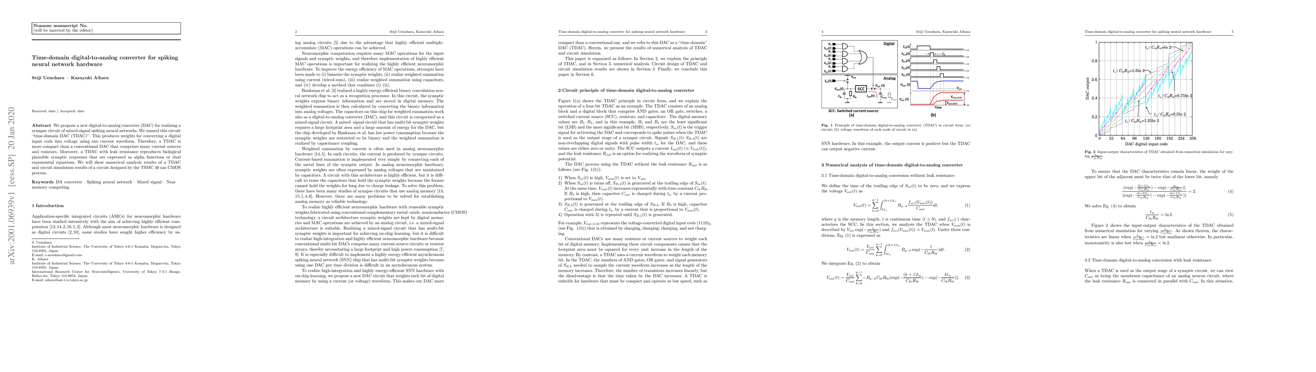 This research introduces a time-domain digital-to-analog converter (TDAC) designed for mixed-signal spiking neural networks, offering a compact synapse circuit that uses a single current waveform to convert digital inputs into voltages. The TDAC also reproduces biologically plausible synaptic responses, validated through numerical and TSMC 40 nm CMOS process simulations.