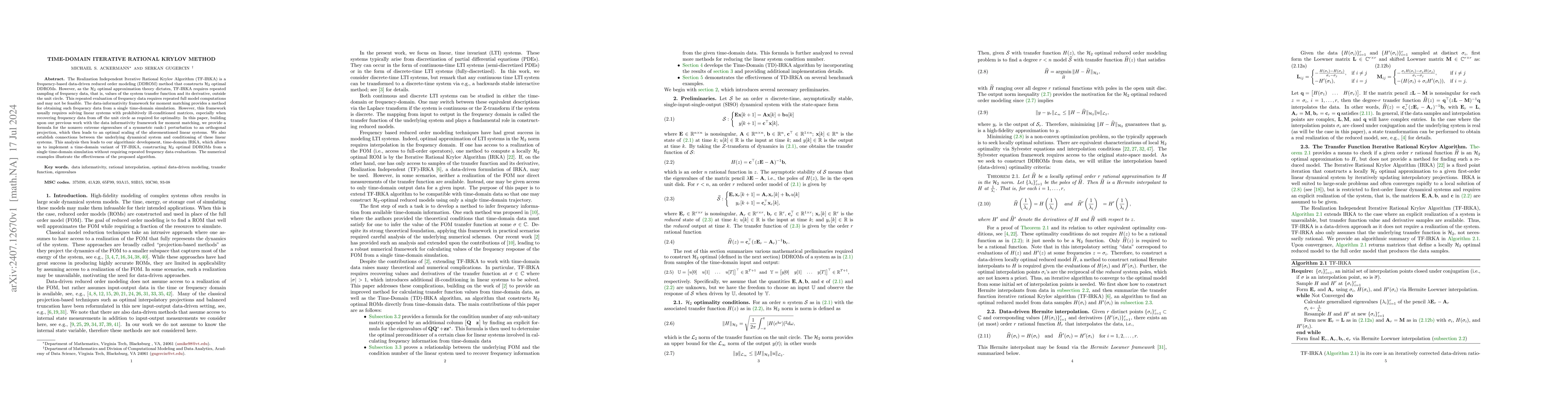 The Realization Independent Iterative Rational Krylov Algorithm (TF-IRKA) is a frequency-based data-driven reduced order modeling (DDROM) method that constructs $\mathcal H_2$ optimal DDROMs. However, as the $\mathcal H_2$ optimal approximation theory dictates, TF-IRKA requires repeated sampling of frequency data, that is, values of the system transfer function and its derivative, outside the unit circle. This repeated evaluation of frequency data requires repeated full model computations and may not be feasible. The data-informativity framework for moment matching provides a method for obtaining such frequency data from a single time-domain simulation. However, this framework usually requires solving linear systems with prohibitively ill-conditioned matrices, especially when recovering frequency data from off the unit circle as required for optimality. In this paper, building upon our previous work with the data informativity framework for moment matching, we provide a formula for the nonzero extreme eigenvalues of a symmetric rank-$1$ perturbation to an orthogonal projection, which then leads to an optimal scaling of the aforementioned linear systems. We also establish connections between the underlying dynamical system and conditioning of these linear systems. This analysis then leads to our algorithmic development, time-domain IRKA, which allows us to implement a time-domain variant of TF-IRKA, constructing $\mathcal H_2$ optimal DDROMs from a single time-domain simulation without requiring repeated frequency data evaluations. The numerical examples illustrate the effectiveness of the proposed algorithm.