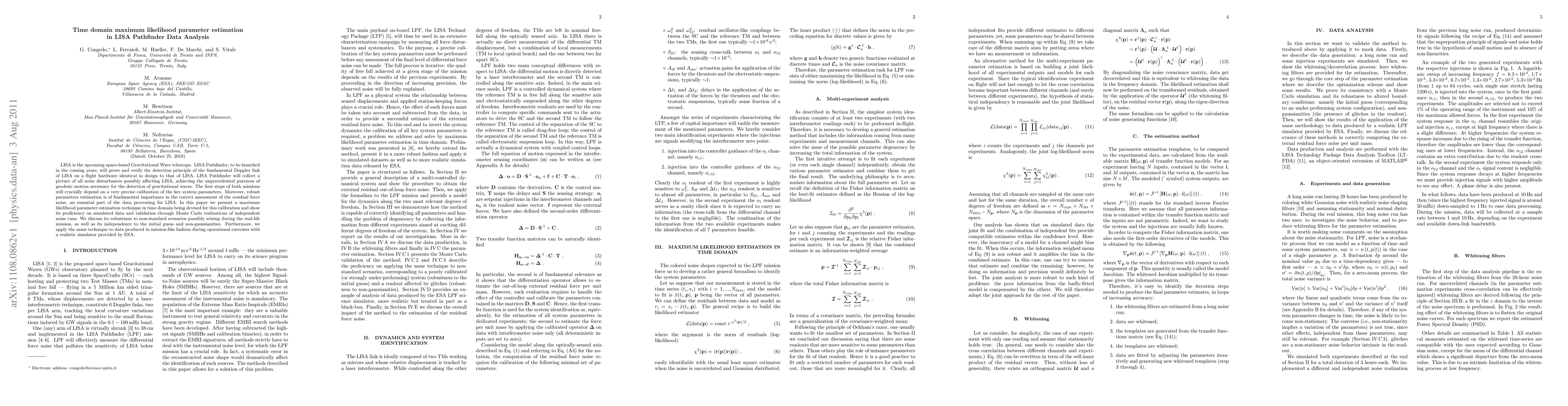 LISA is the upcoming space-based Gravitational Wave telescope. LISA Pathfinder, to be launched in the coming years, will prove and verify the detection principle of the fundamental Doppler link of LISA on a flight hardware identical in design to that of LISA. LISA Pathfinder will collect a picture of all noise disturbances possibly affecting LISA, achieving the unprecedented pureness of geodesic motion necessary for the detection of gravitational waves. The first steps of both missions will crucially depend on a very precise calibration of the key system parameters. Moreover, robust parameters estimation is of fundamental importance in the correct assessment of the residual force noise, an essential part of the data processing for LISA. In this paper we present a maximum likelihood parameter estimation technique in time domain being devised for this calibration and show its proficiency on simulated data and validation through Monte Carlo realizations of independent noise runs. We discuss its robustness to non-standard scenarios possibly arising during the real-life mission, as well as its independence to the initial guess and non-gaussianities. Furthermore, we apply the same technique to data produced in mission-like fashion during operational exercises with a realistic simulator provided by ESA.