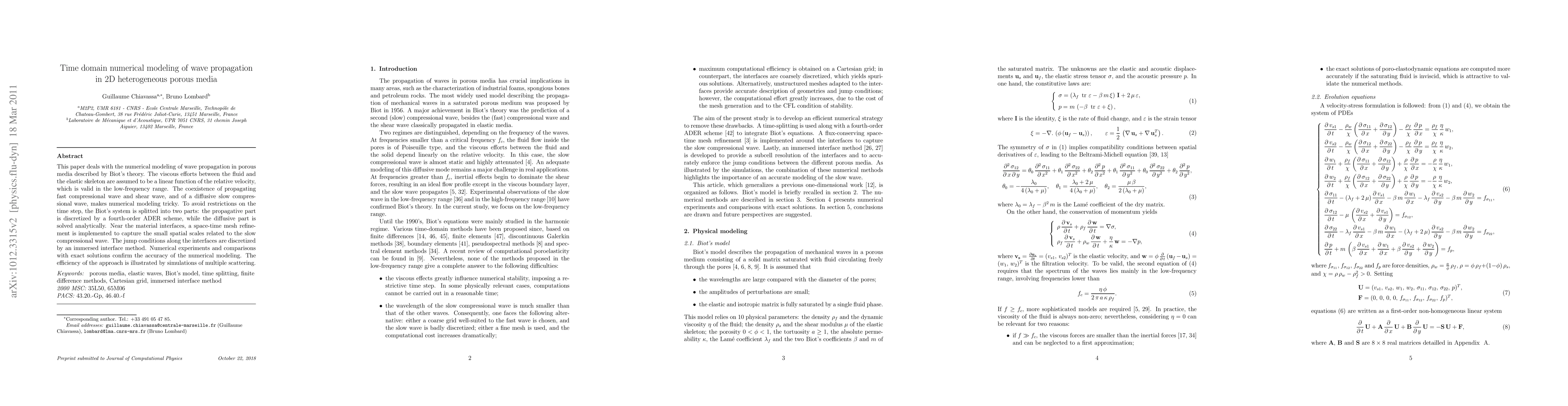This paper deals with the numerical modeling of wave propagation in porous media described by Biot's theory. The viscous efforts between the fluid and the elastic skeleton are assumed to be a linear function of the relative velocity, which is valid in the low-frequency range. The coexistence of propagating fast compressional wave and shear wave, and of a diffusive slow compressional wave, makes numerical modeling tricky. To avoid restrictions on the time step, the Biot's system is splitted into two parts: the propagative part is discretized by a fourth-order ADER scheme, while the diffusive part is solved analytically. Near the material interfaces, a space-time mesh refinement is implemented to capture the small spatial scales related to the slow compressional wave. The jump conditions along the interfaces are discretized by an immersed interface method. Numerical experiments and comparisons with exact solutions confirm the accuracy of the numerical modeling. The efficiency of the approach is illustrated by simulations of multiple scattering.