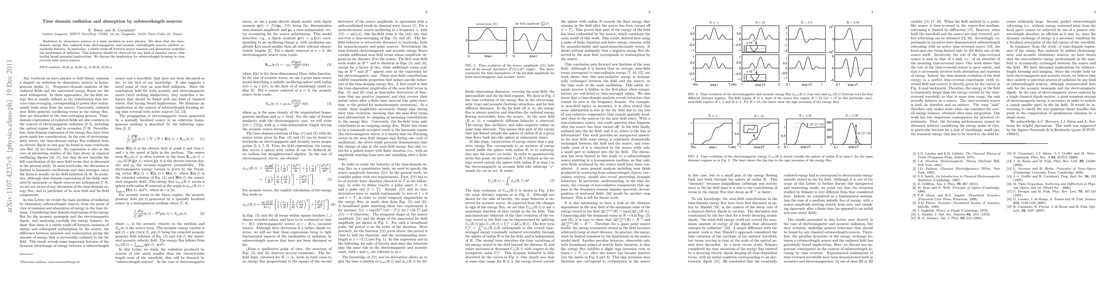Radiation by elementary sources is a basic problem in wave physics. We show that the time-domain energy flux radiated from electromagnetic and acoustic subwalength sources exhibits remarkable features. In particular, a subtle trade-off between source emission and absorption underlies the mechanism of radiation. This behavior should be observed for any kind of classical waves, thus having broad potential implications. We discuss the implication for subwavelength focusing by time reversal with active sources.