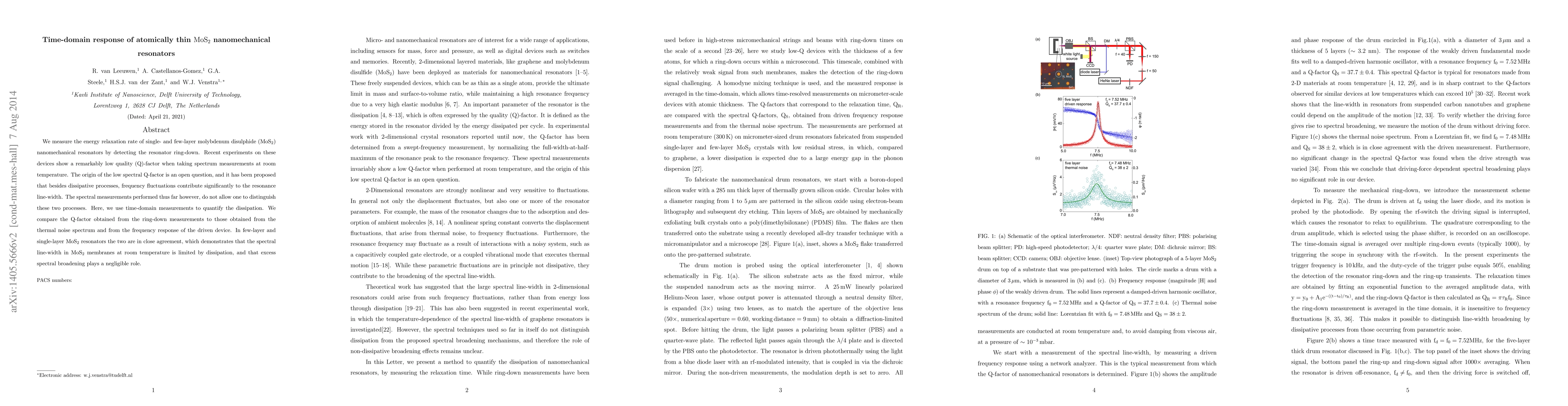 We measure the energy relaxation rate of single- and few-layer molybdenum disulphide ($\mathrm{MoS_2}$) nanomechanical resonators by detecting the resonator ring-down. Recent experiments on these devices show a remarkably low quality (Q)-factor when taking spectrum measurements at room temperature. The origin of the low spectral Q-factor is an open question, and it has been proposed that besides dissipative processes, frequency fluctuations contribute significantly to the resonance line-width. The spectral measurements performed thus far however, do not allow one to distinguish these two processes. Here, we use time-domain measurements to quantify the dissipation. We compare the Q-factor obtained from the ring-down measurements to those obtained from the thermal noise spectrum and from the frequency response of the driven device. In few-layer and single-layer $\mathrm{MoS_2}$ resonators the two are in close agreement, which demonstrates that the spectral line-width in $\mathrm{MoS_2}$ membranes at room temperature is limited by dissipation, and that excess spectral broadening plays a negligible role.