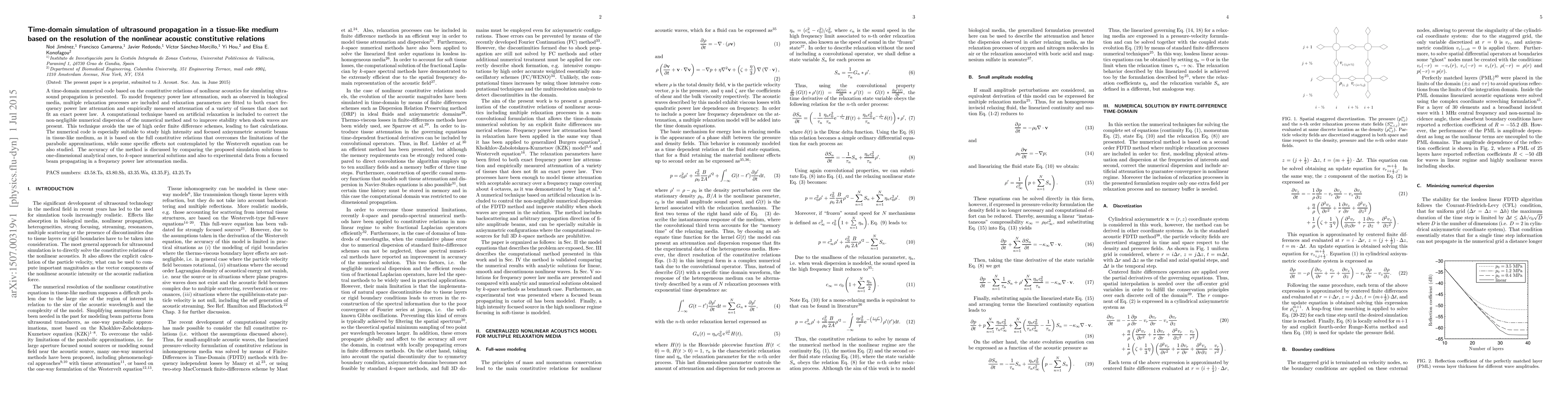 This paper presents a time-domain numerical code for simulating ultrasound propagation in tissue-like media based on nonlinear acoustic constitutive relations, incorporating multiple relaxation processes for frequency power law attenuation. The code employs artificial relaxation to correct numerical dispersion and improve stability, enabling fast calculations and accurate simulations of high intensity and focused acoustic beams.