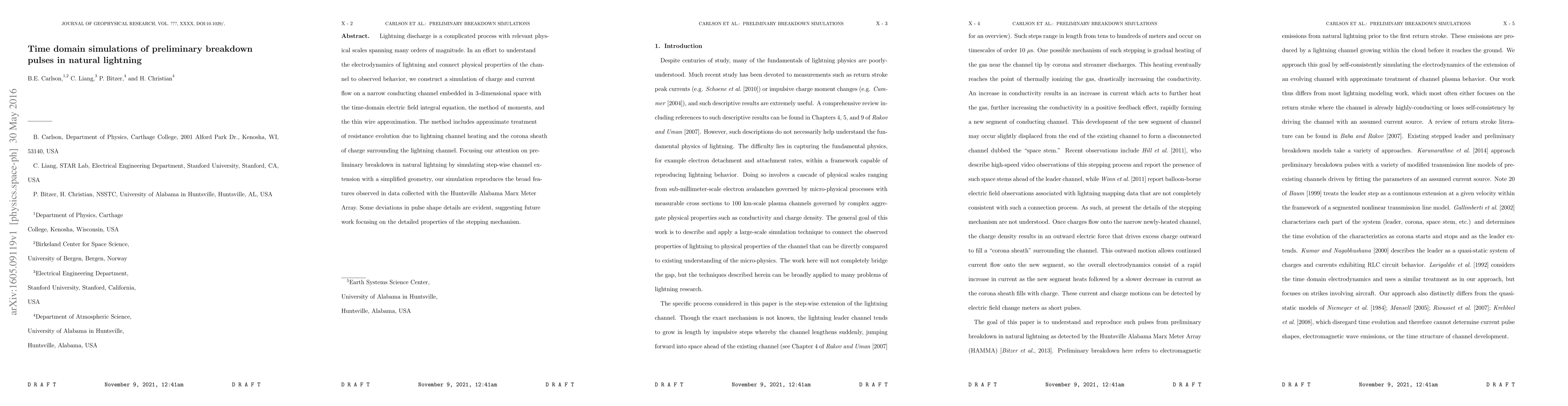 Lightning discharge is a complicated process with relevant physical scales spanning many orders of magnitude. In an effort to understand the electrodynamics of lightning and connect physical properties of the channel to observed behavior, we construct a simulation of charge and current flow on a narrow conducting channel embedded in three-dimensional space with the time domain electric field integral equation, the method of moments, and the thin-wire approximation. The method includes approximate treatment of resistance evolution due to lightning channel heating and the corona sheath of charge surrounding the lightning channel. Focusing our attention on preliminary breakdown in natural lightning by simulating stepwise channel extension with a simplified geometry, our simulation reproduces the broad features observed in data collected with the Huntsville Alabama Marx Meter Array. Some deviations in pulse shape details are evident, suggesting future work focusing on the detailed properties of the stepping mechanism.