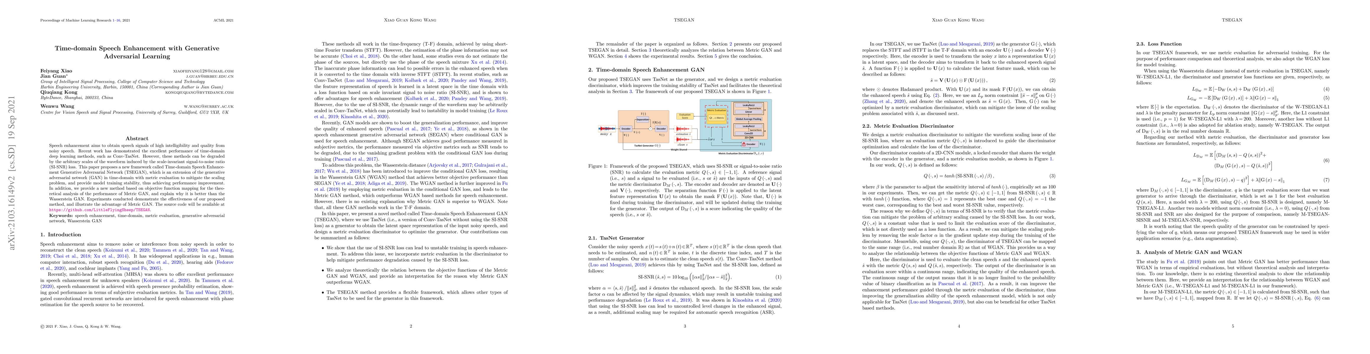 This paper introduces TSEGAN, a time-domain speech enhancement framework based on a generative adversarial network (GAN) to improve intelligibility and quality of noisy speech. It addresses the scaling issue of existing methods by using a metric evaluation approach, achieving better performance and training stability compared to Wasserstein GAN.